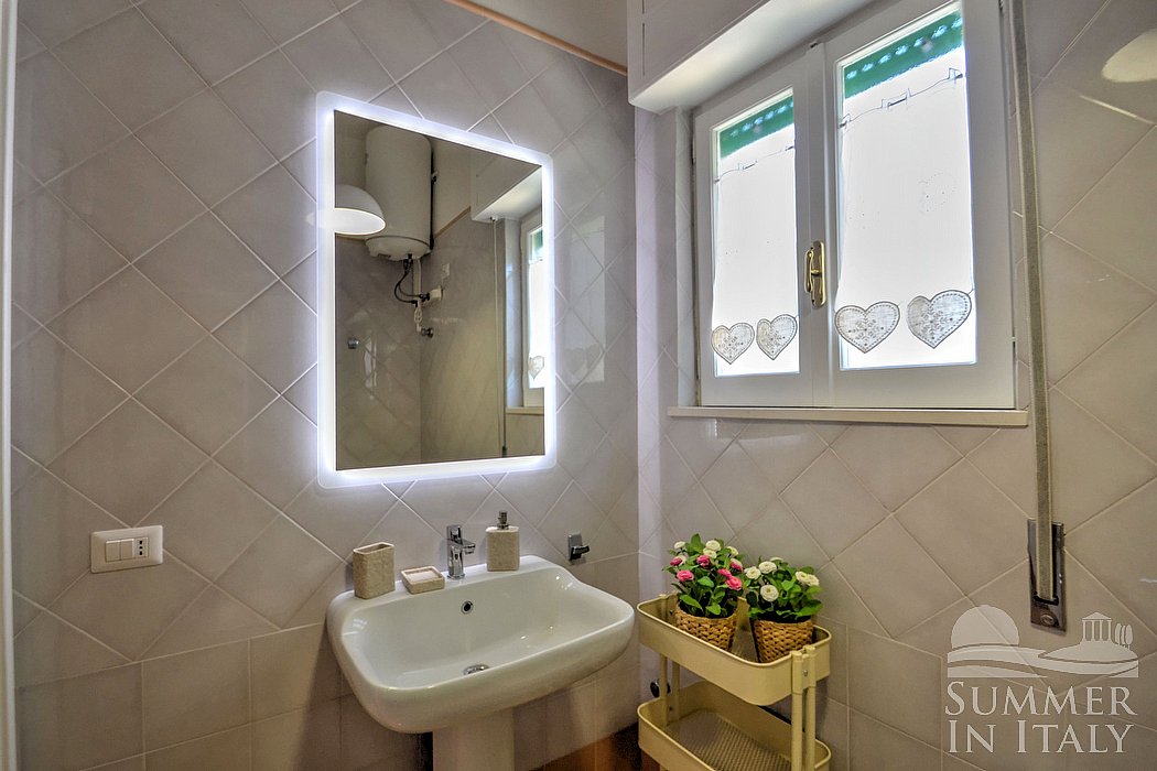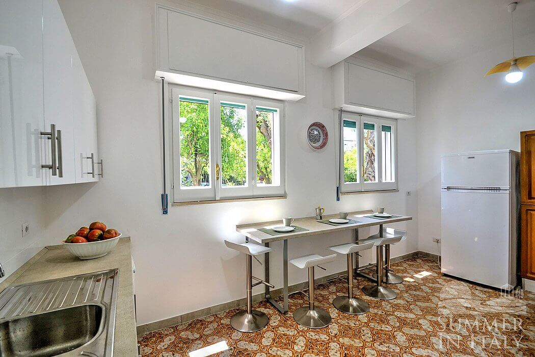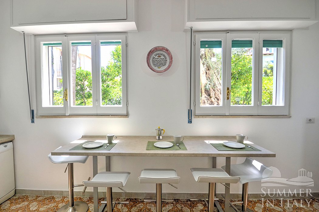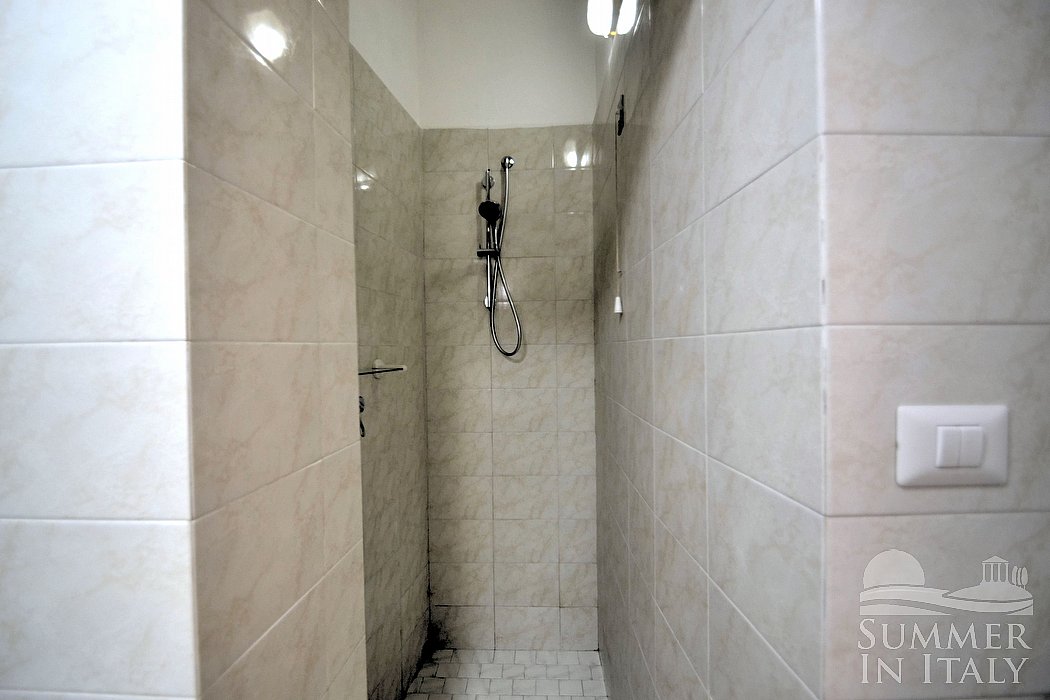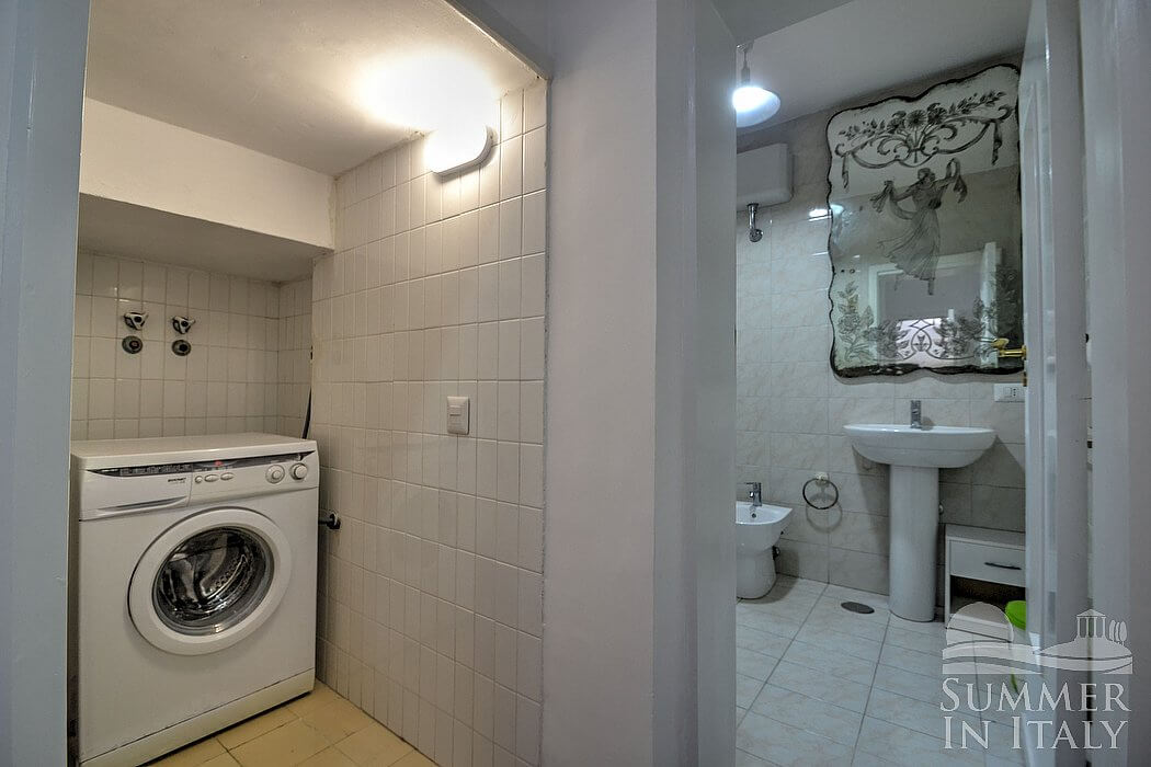 You will be able to enter the kitchen from the living room through an access area. It is equipped with a five-burner gas cooker, an electric oven, a refrigerator with freezer, a dishwasher, a microwave oven, an Italian-style coffee-maker, an American-style coffee-maker (bring your filters!) and a kettle. The dining tableis a wall mounted table, and can accommodate five guests. From the kitchen a French door will take you to the alleyway at the rear of the house. The room also has two windows.