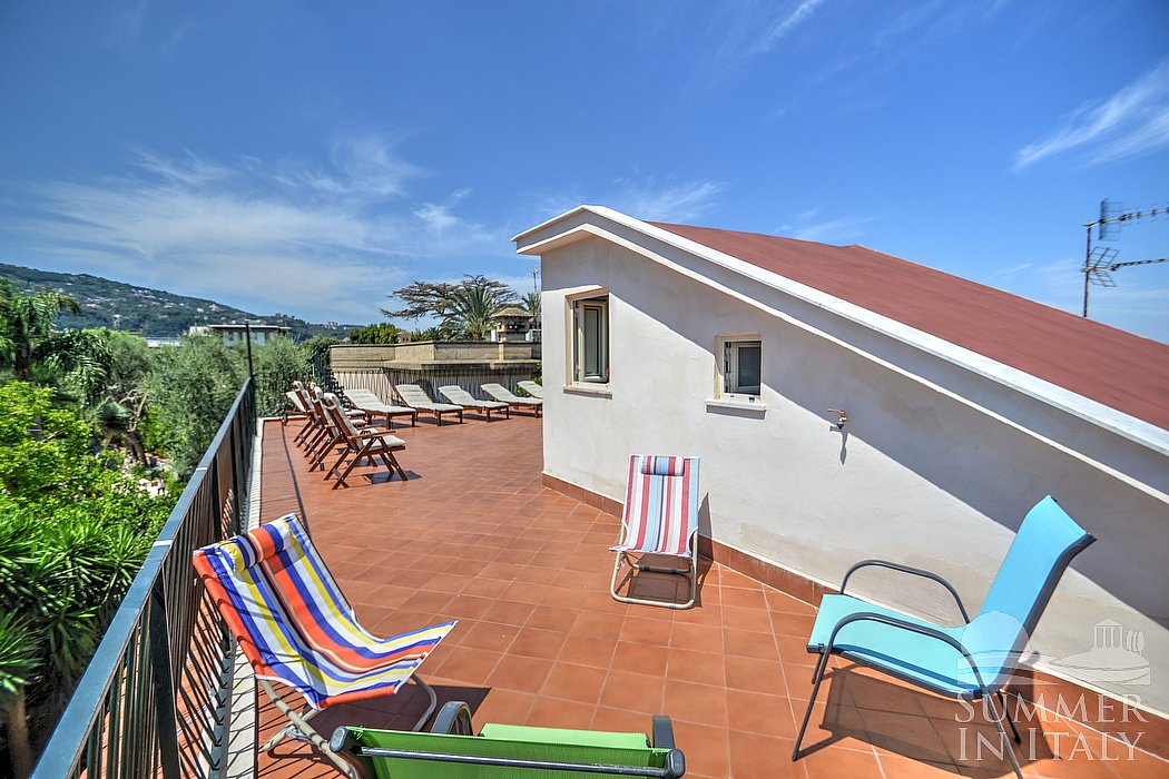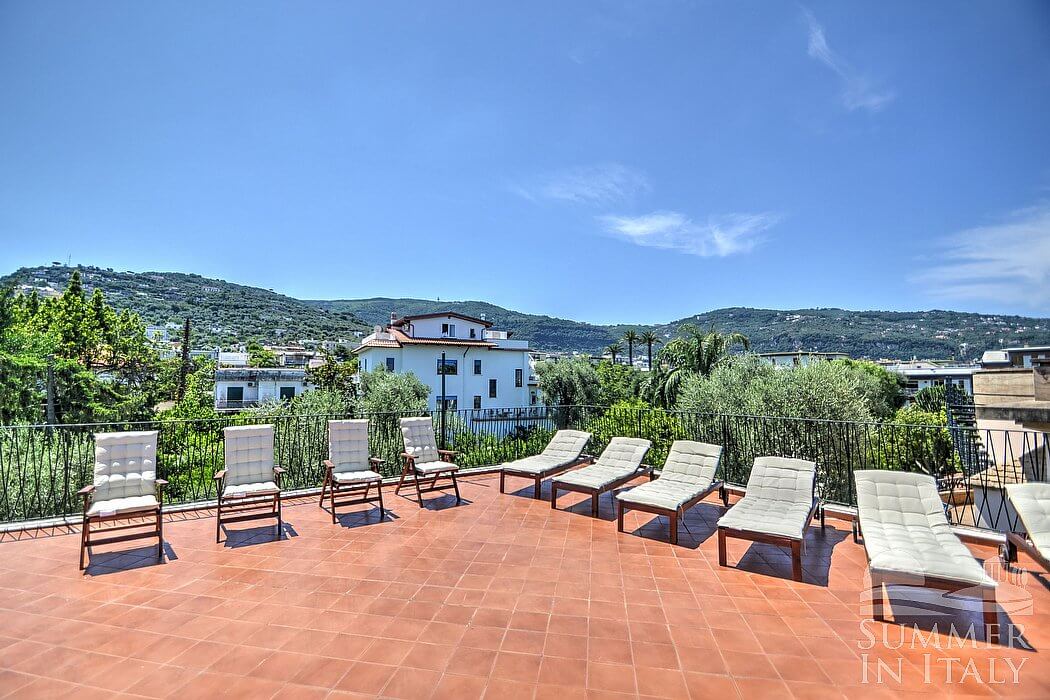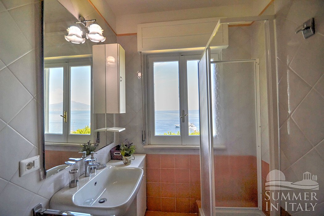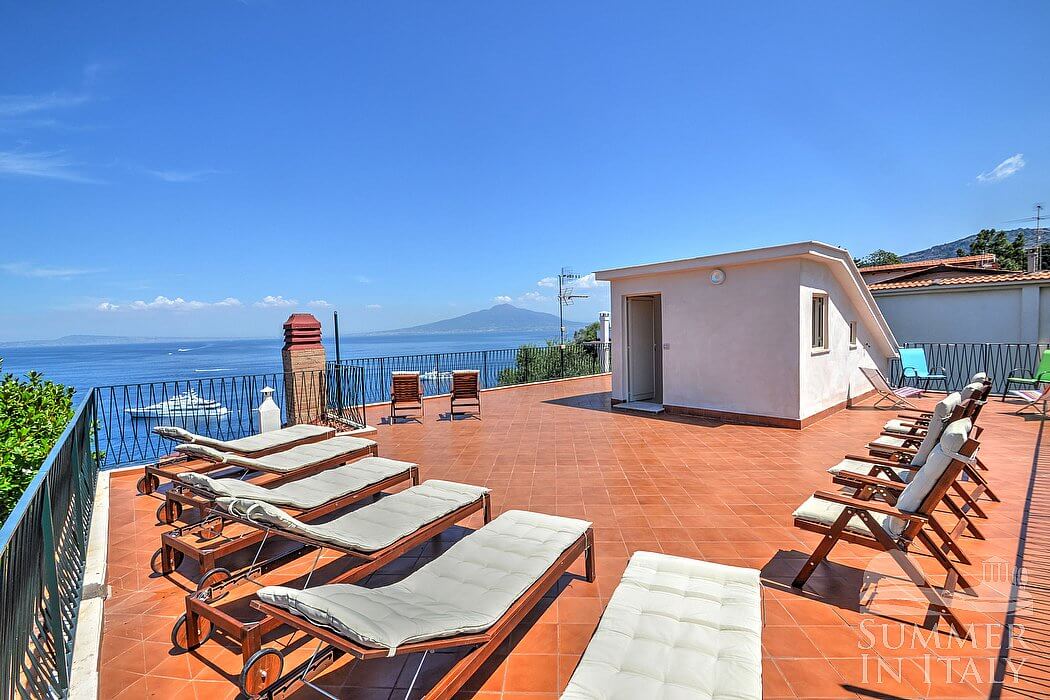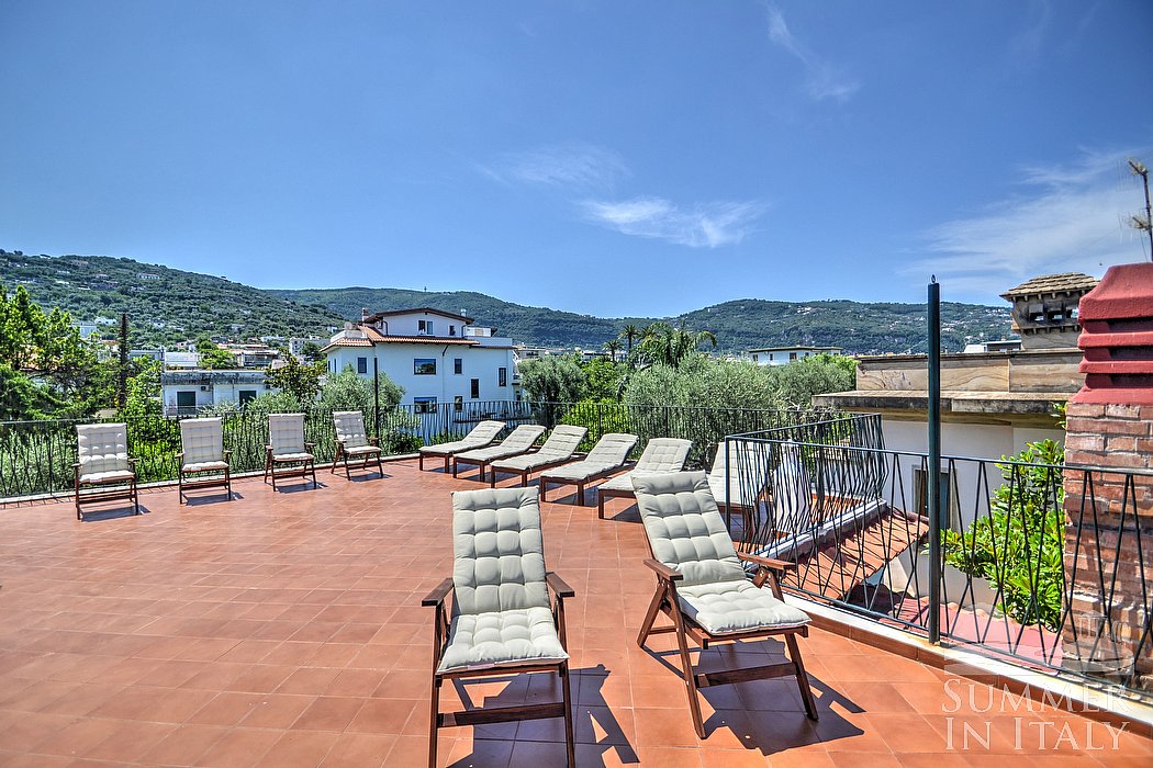 Villa Primosole is a spacious three-story villa situated in a quiet location, a few minutes from the town center. It sleeps 16 people. From Villa Primosole you will enjoy a thrilling view of the sea , of Sorrento and of Mount Vesuvius. Villa Primosole is 250 square meters (2690 square feet). It features private terraces with a view of the sea, a private patio, a private garden, air conditioning (please read description below to check in which rooms the units are installed), winter heating and WI-FI Internet access.