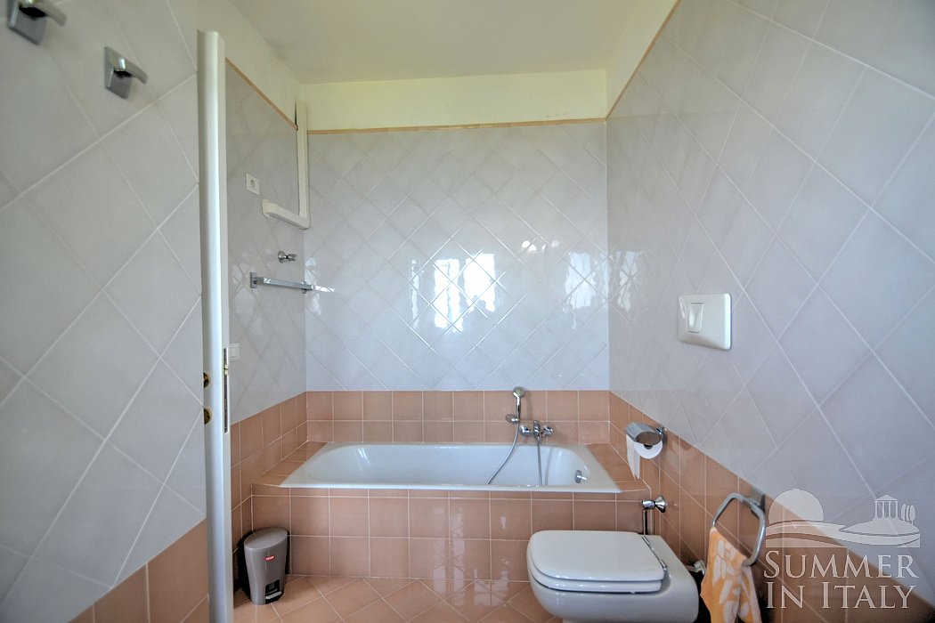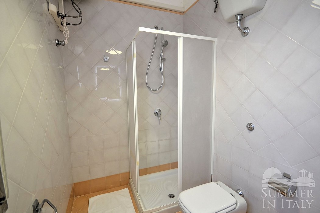 You will be able to enter the second bedroom through an access area. The bedroom has a matrimonial bed (160 cm/62 inches, wider than a queen-size bed). An additional twin bed (80 cm/32 inches) is available (if requested in advance) to make it a triple room. The furnishings include a bedroom chair. In this room you will find a television (local channels). From the bedroom you will be able to enter a second terrace through a French door. The bedroom is equipped with an air conditioning/heating unit. This bedroom has an en-suite bathroom, equipped with a washbasin, a toilet, a bathtub with shower wand and a hairdryer.