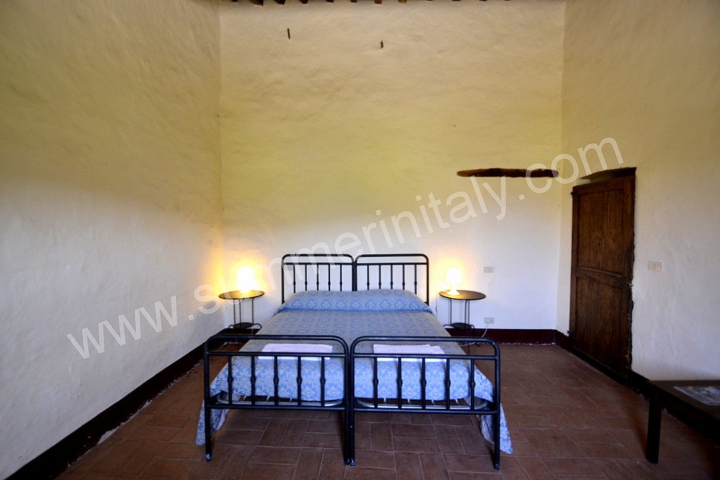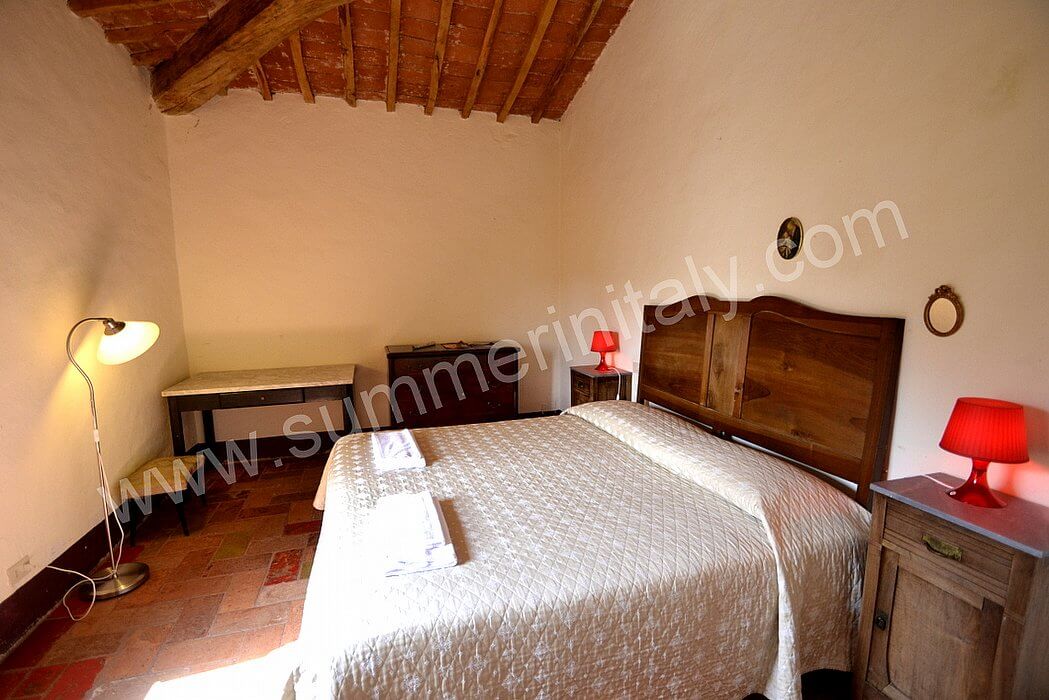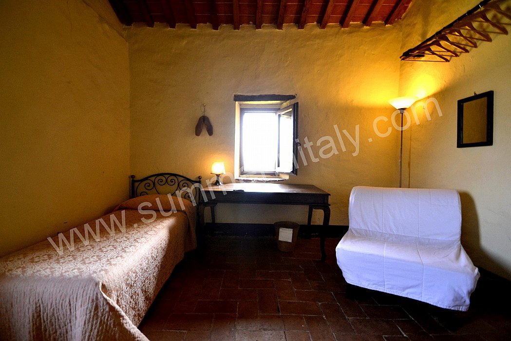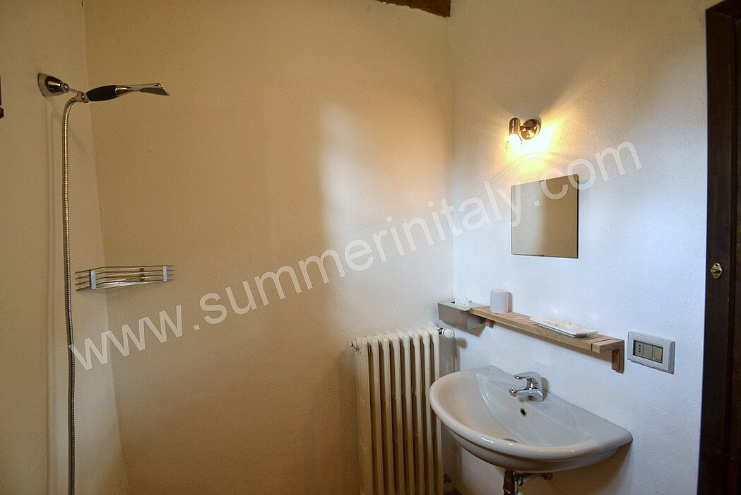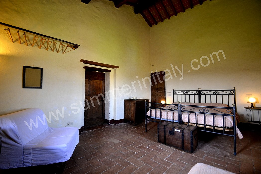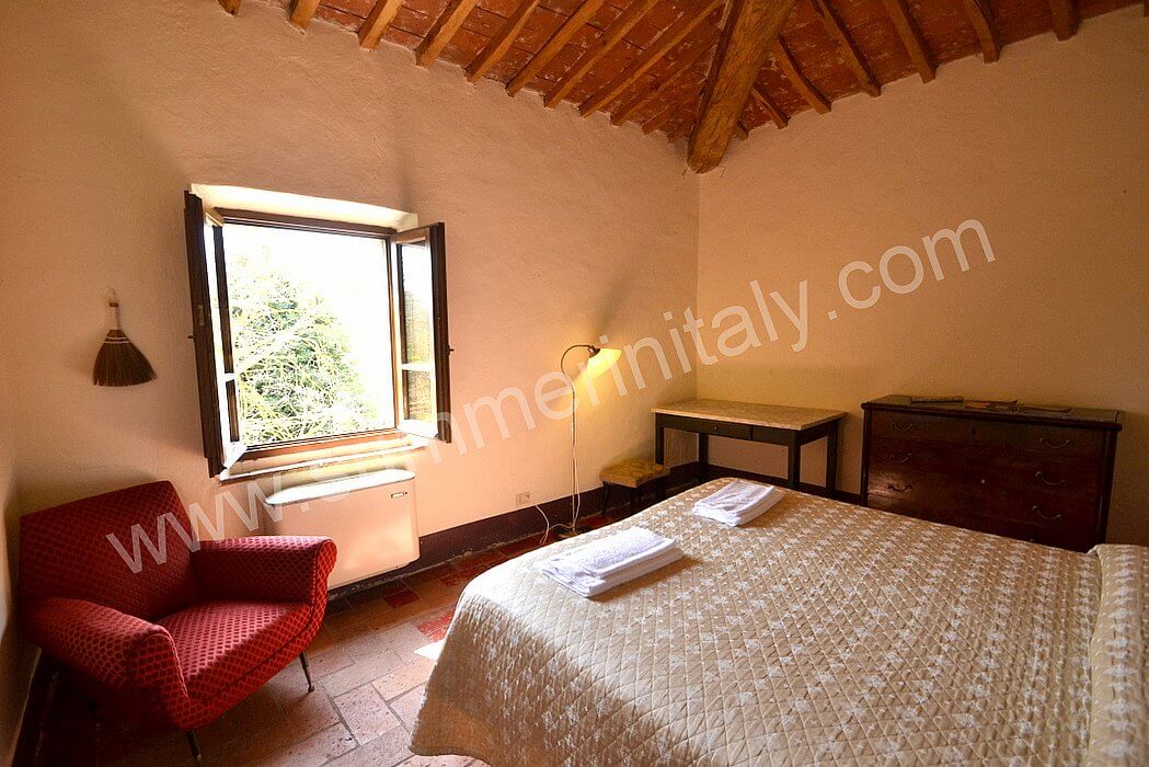 You will be able to enter the second living room from the along an external stairway, climbing 16 steps. The floor is paved with terracotta tiles. The ceiling has characteristic exposed wood beams. The furnishings are rural and characteristic of the Tuscan house. There is a big and age-old fireplace made of bricks. In the living room you will also find a cooking area. The kitchenette is equipped with a four-burner gas cooker, an electric oven, a small refrigerator with freezer and an Italian-style coffee-maker. The dining table can accommodate eight guests. The room has a window with a view of the greenery and of the hills.