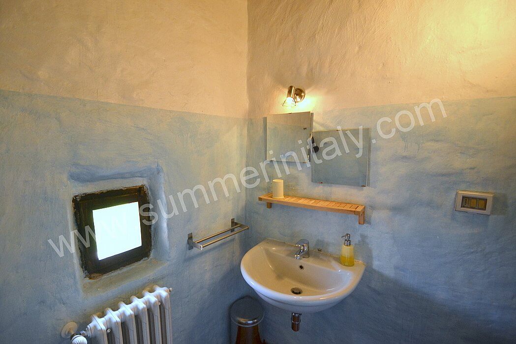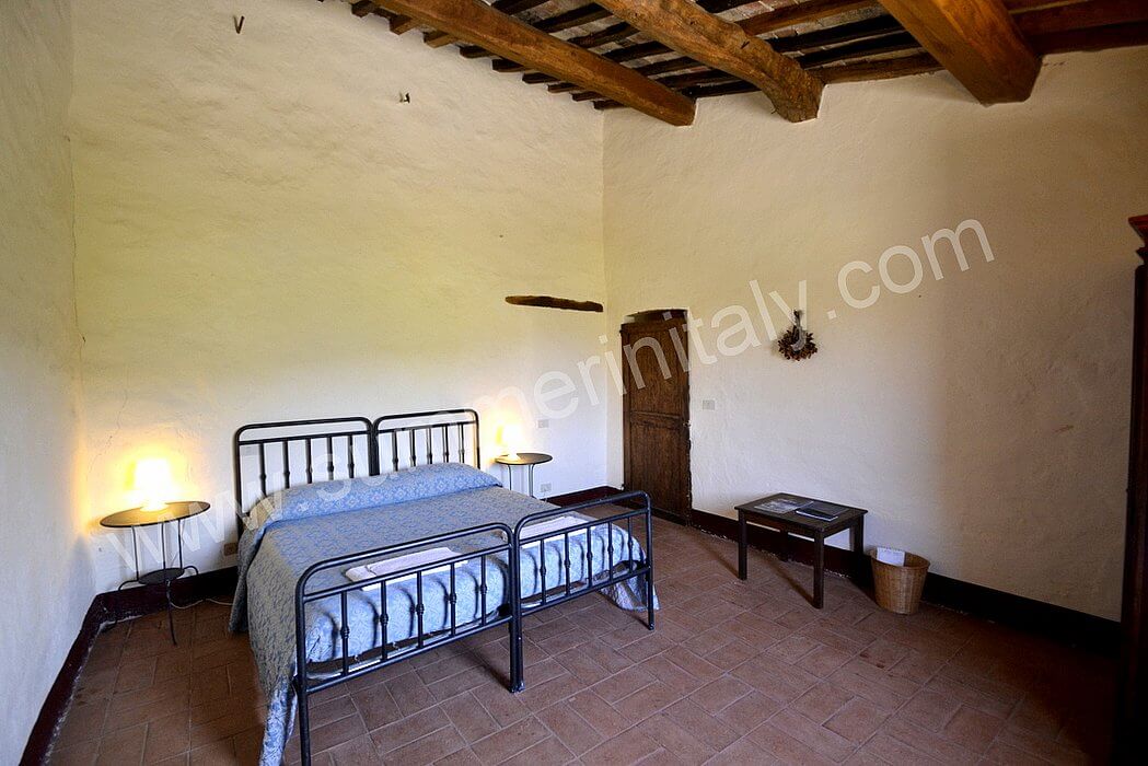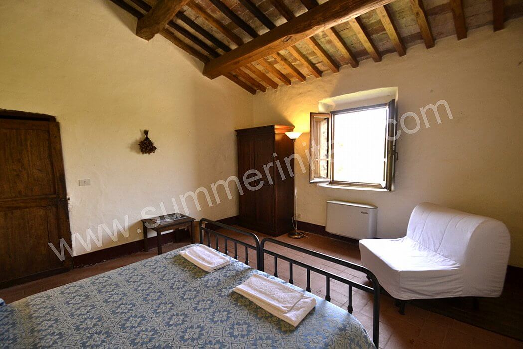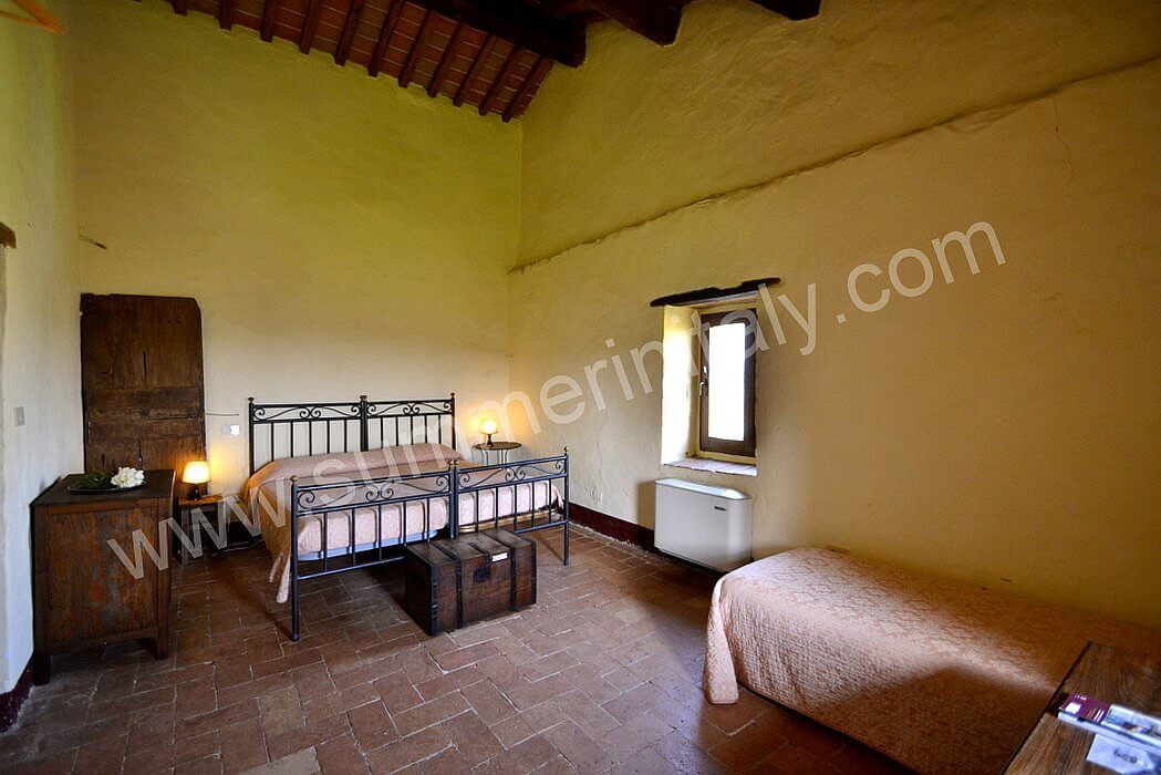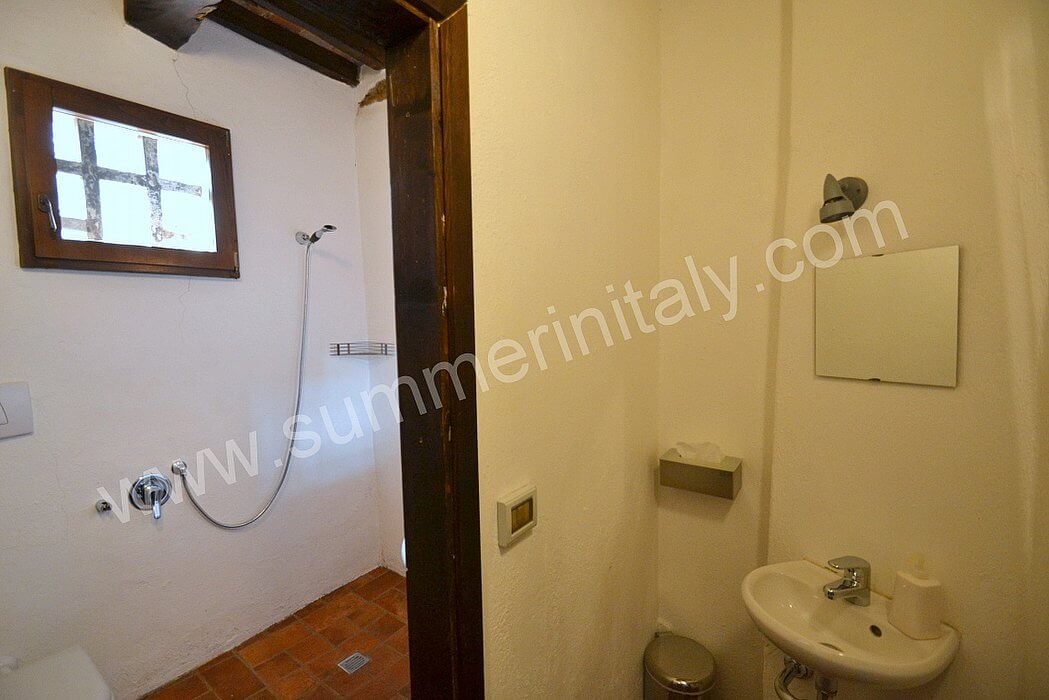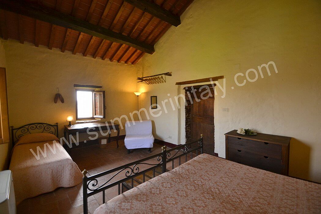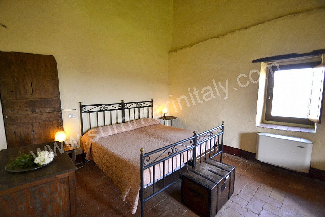 You will be able to enter the second living room from the along an external stairway, climbing 16 steps. The floor is paved with terracotta tiles. The ceiling has characteristic exposed wood beams. The furnishings are rural and characteristic of the Tuscan house. There is a big and age-old fireplace made of bricks. In the living room you will also find a cooking area. The kitchenette is equipped with a four-burner gas cooker, an electric oven, a small refrigerator with freezer and an Italian-style coffee-maker. The dining table can accommodate eight guests. The room has a window with a view of the greenery and of the hills.