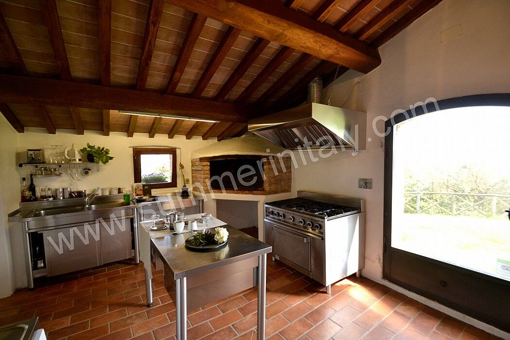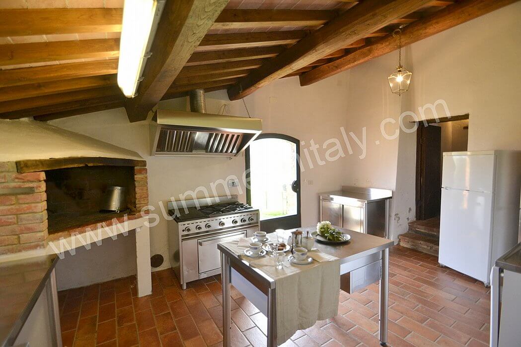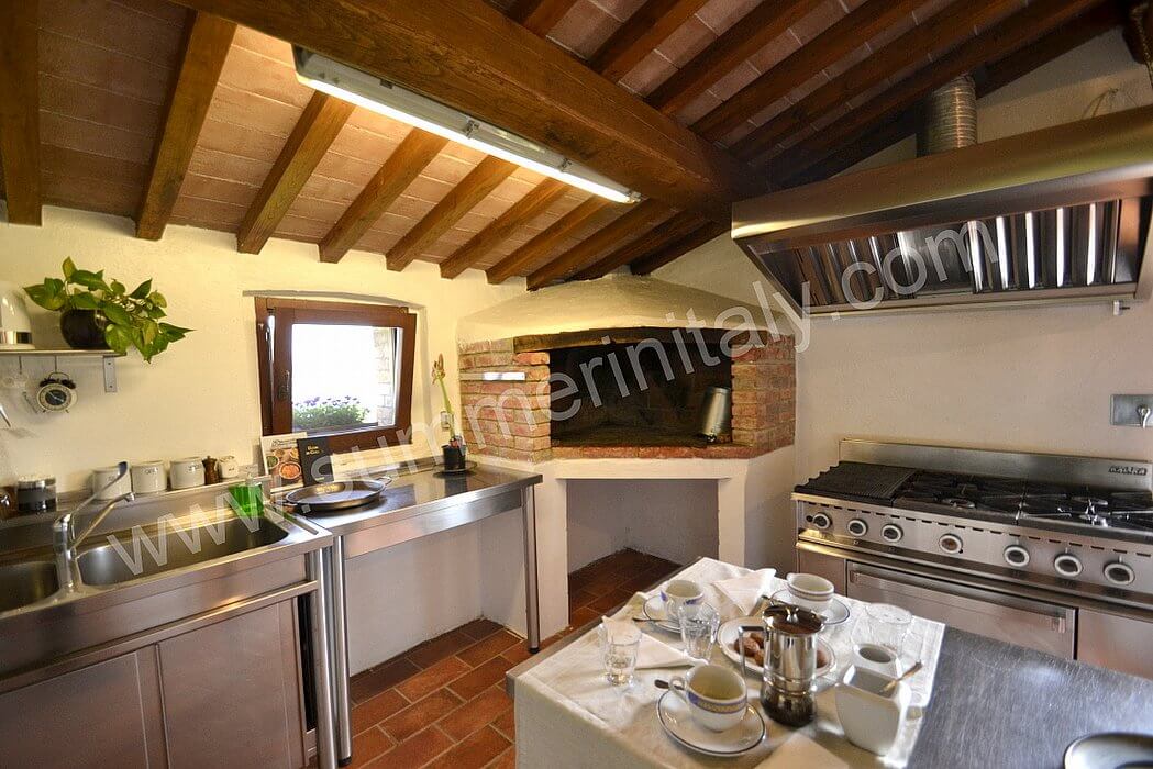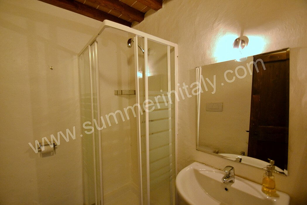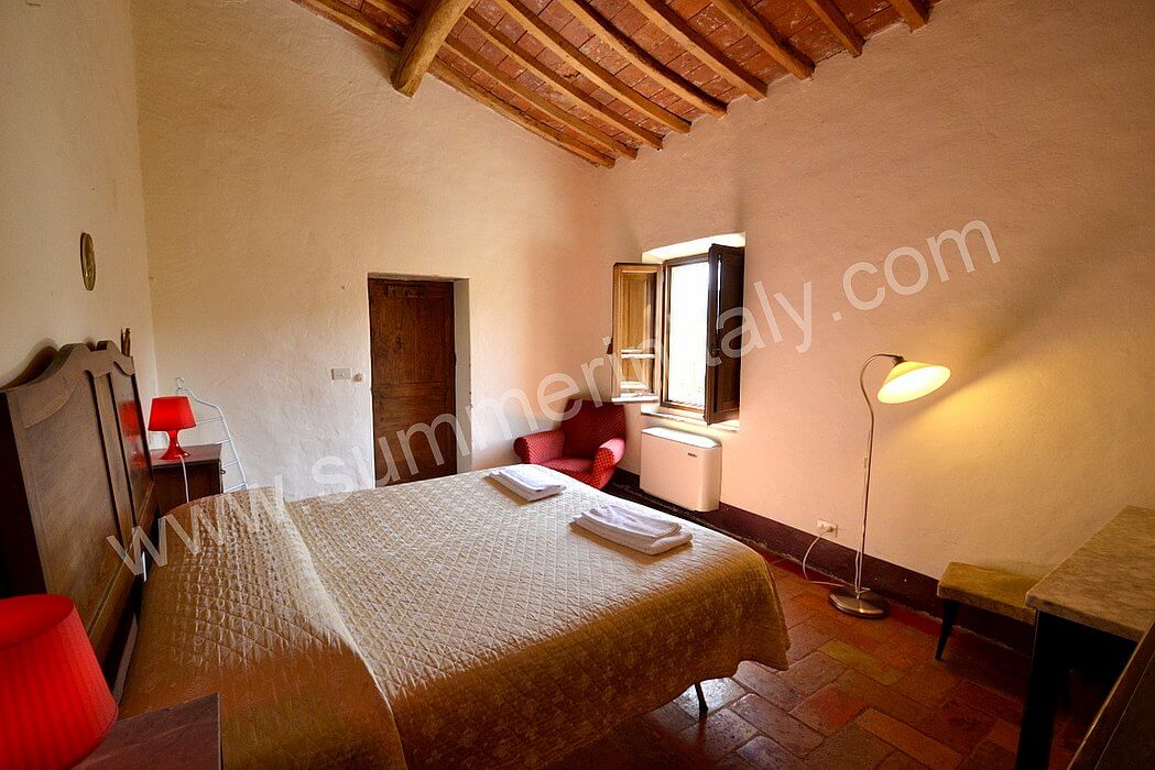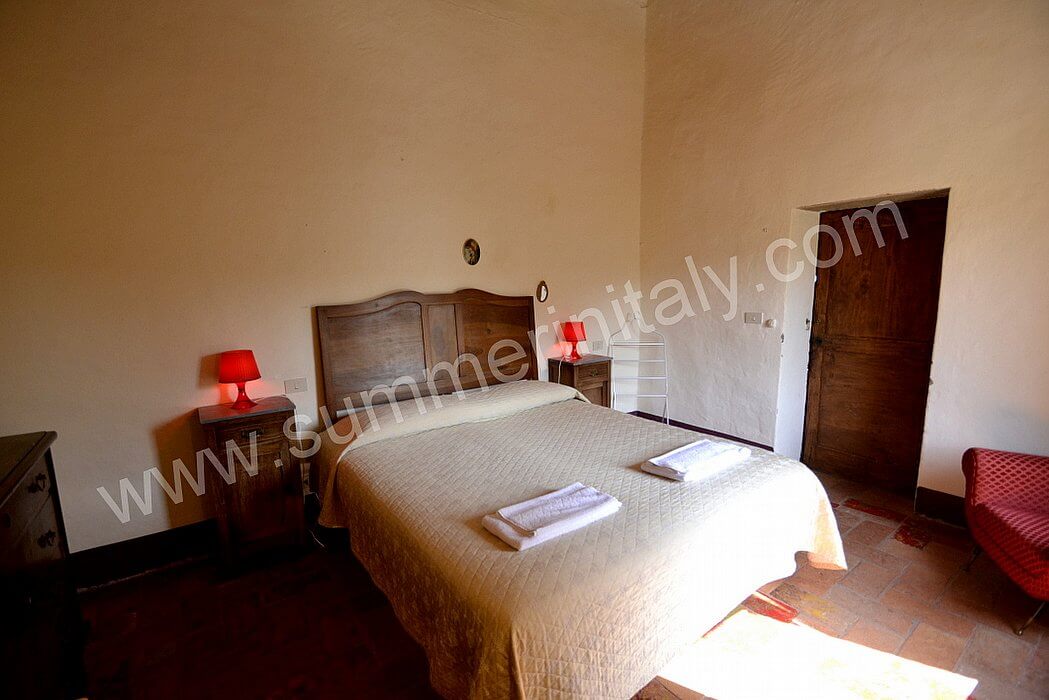 You will be able to enter the second living room from the along an external stairway, climbing 16 steps. The floor is paved with terracotta tiles. The ceiling has characteristic exposed wood beams. The furnishings are rural and characteristic of the Tuscan house. There is a big and age-old fireplace made of bricks. In the living room you will also find a cooking area. The kitchenette is equipped with a four-burner gas cooker, an electric oven, a small refrigerator with freezer and an Italian-style coffee-maker. The dining table can accommodate eight guests. The room has a window with a view of the greenery and of the hills.