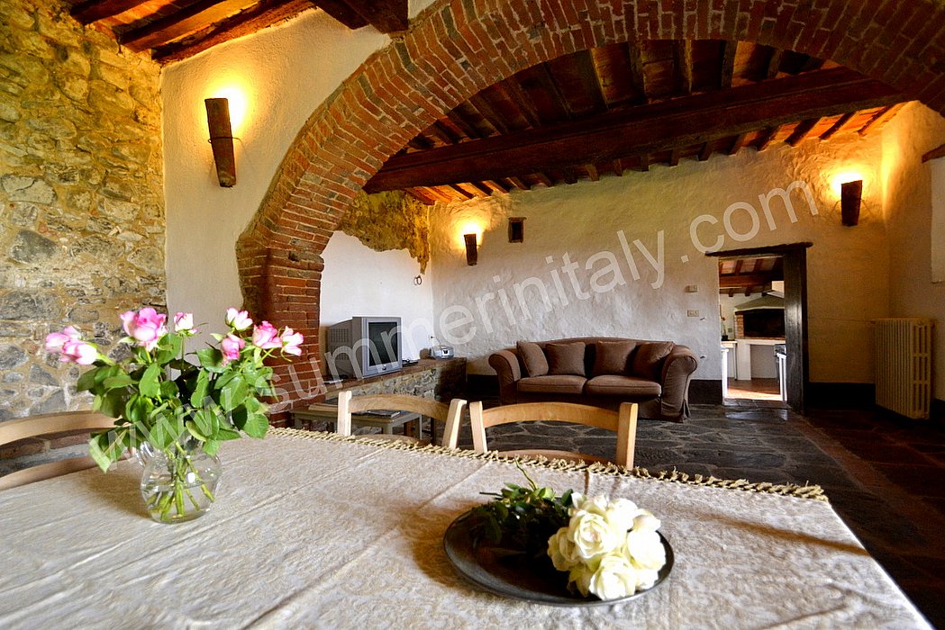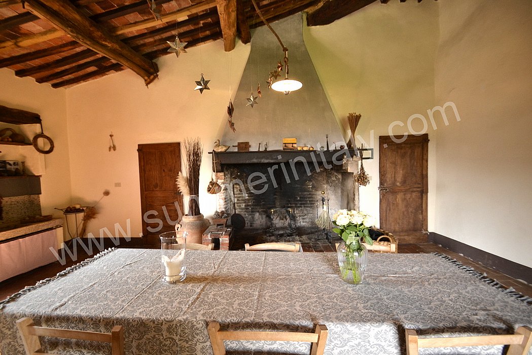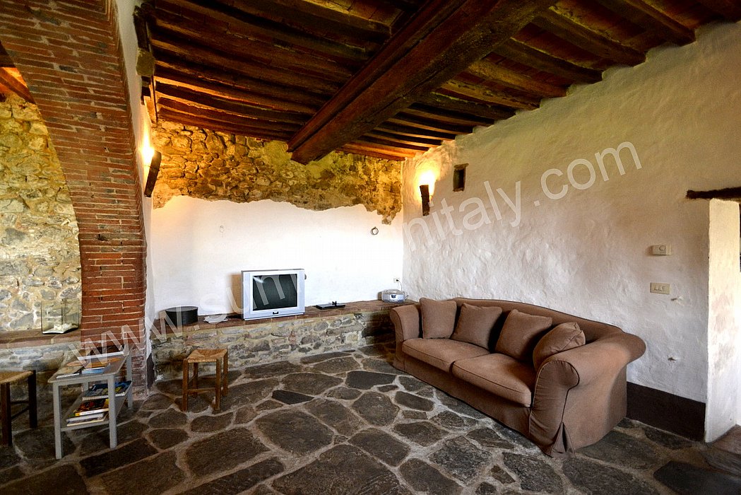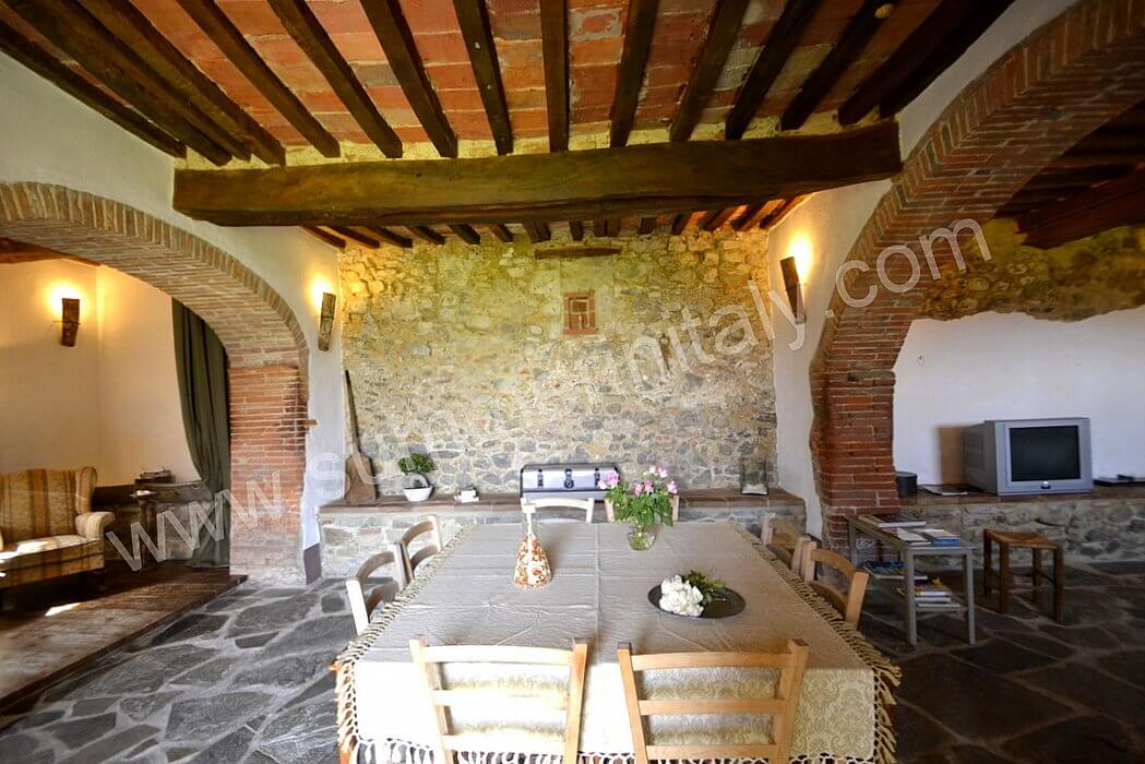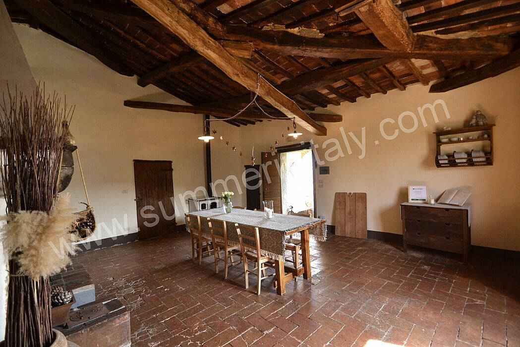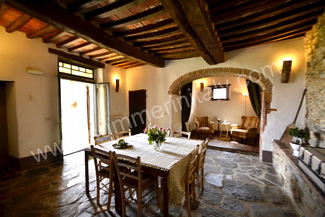 The first living room is paved with ancient stone tiles. The ceiling has characteristic exposed wood beams. The furnishings are rural and characteristic of the Tuscan house. The furnishings include a long sofa and two armchairs. The dining table can accommodate eight guests. In this room you will find a television (local channels). From the living room you will be able to enter the garden through a French door. The room also has three windows with a view of the garden.