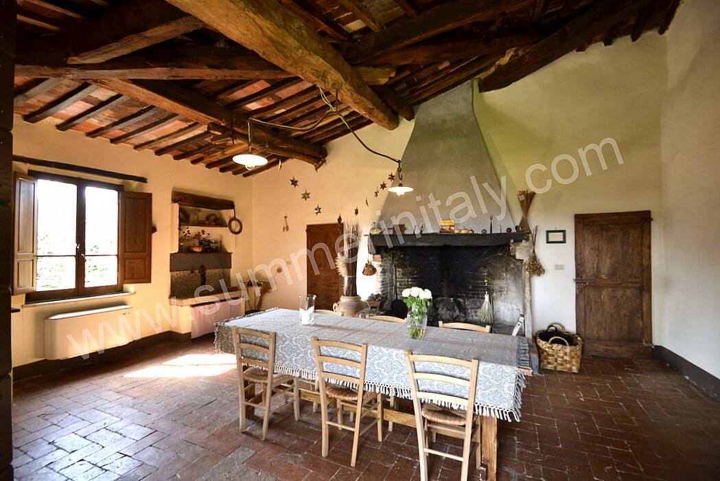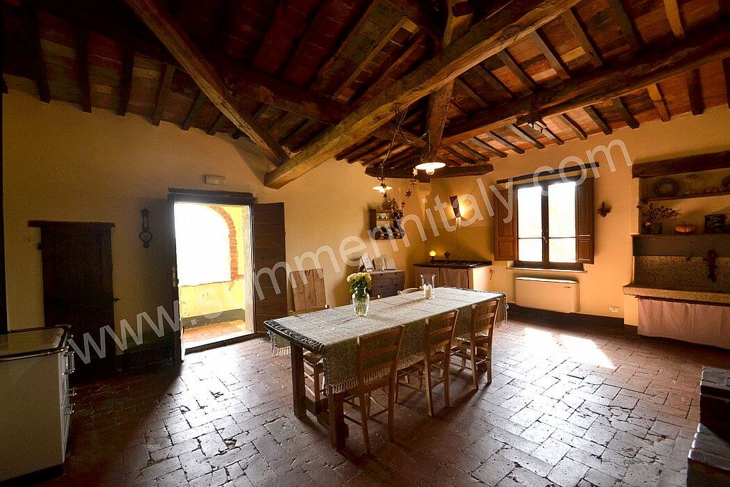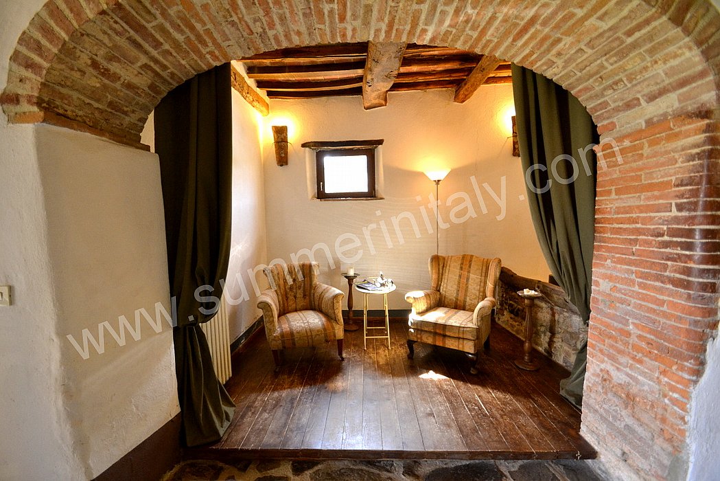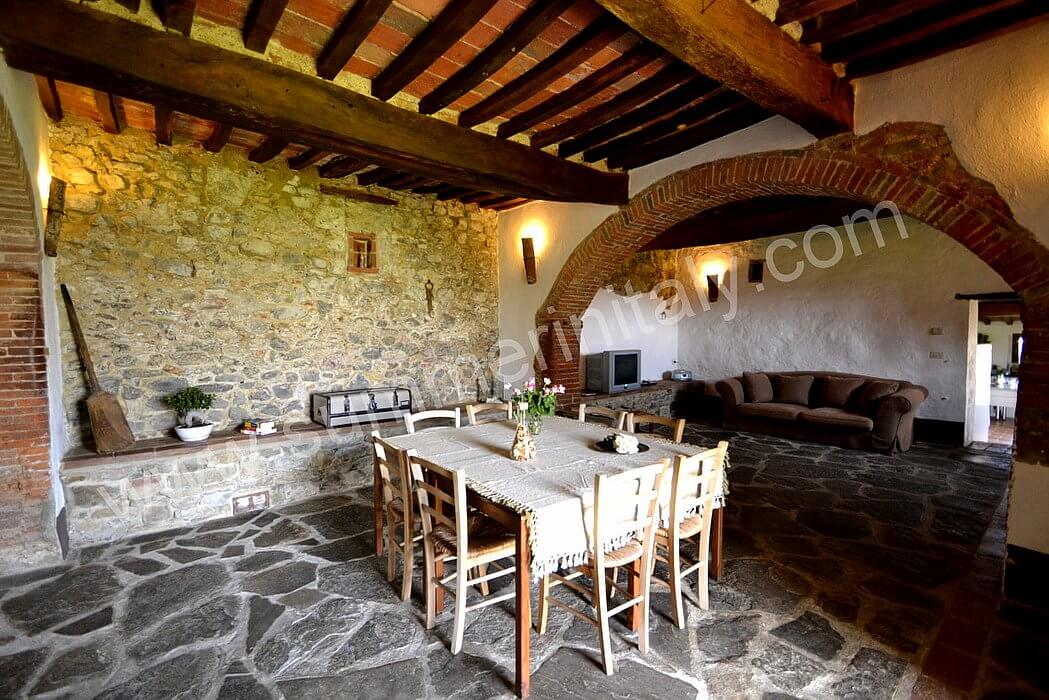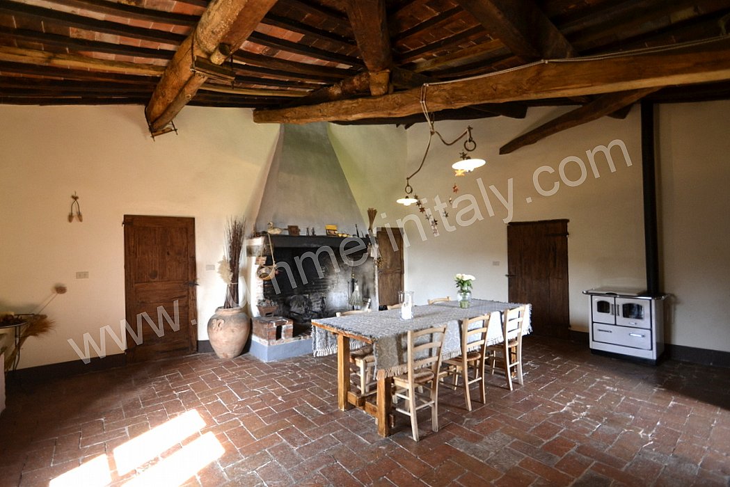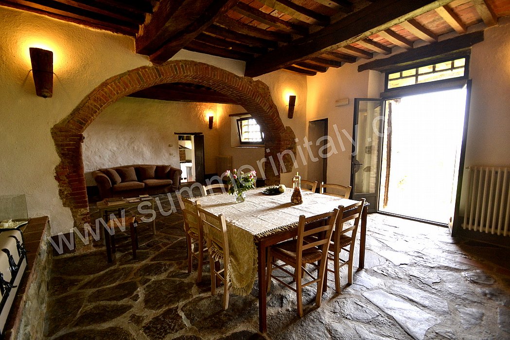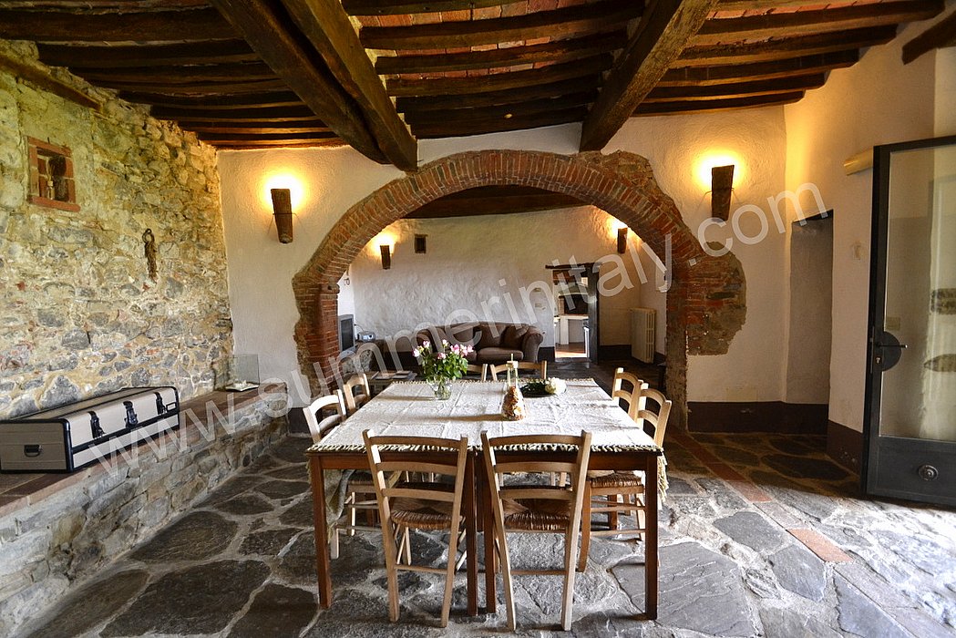 The first living room is paved with ancient stone tiles. The ceiling has characteristic exposed wood beams. The furnishings are rural and characteristic of the Tuscan house. The furnishings include a long sofa and two armchairs. The dining table can accommodate eight guests. In this room you will find a television (local channels). From the living room you will be able to enter the garden through a French door. The room also has three windows with a view of the garden.