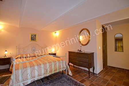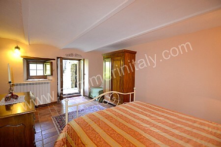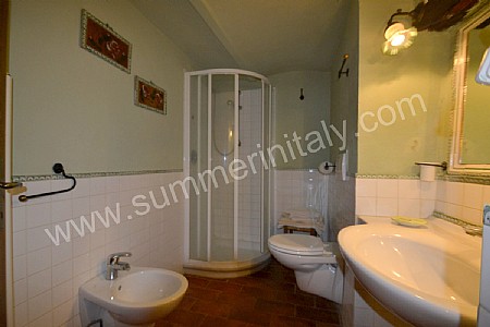The ceiling of the living room has characteristic exposed wood beams and terracotta tiles. The furnishings are warm and elegant. The furnishings include a divan bed for one guest. There is a small fireplace. In the living room you will also find a cooking area. The kitchenette is equipped with a four-burner gas cooker, a small refrigerator with freezer and an Italian-style coffee-maker. The dining table can accommodate three guests. In this room you will find a television (local channels). From the living room you will be able to enter the garden through a double-glazed French door.