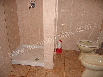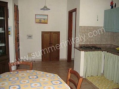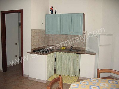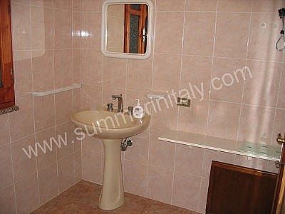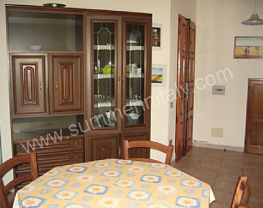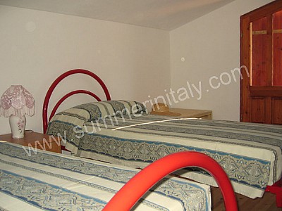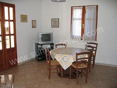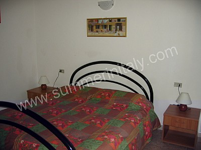 The living room is paved with tiles. The furnishings are simple and comfortable. In the living room you will also find a cooking area. The kitchenette is equipped with a four-burner gas cooker, a refrigerator with freezer, a microwave oven, an Italian-style coffee-maker and other small appliances. The dining table can accommodate four guests. In this room you will find a satellite television (local channels). From the living room you will be able to enter the garden through a double-glazed French door. The room also has a double-glazed window overlooking the gardens of the surrounding houses.