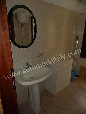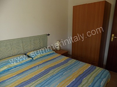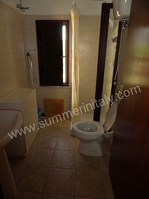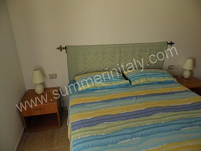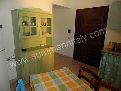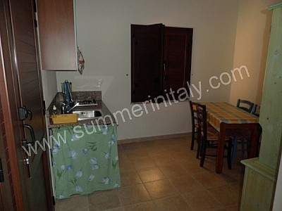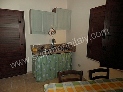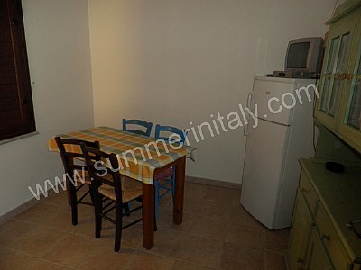 The living room is paved with tiles. The furnishings are simple and comfortable. In the living room you will also find a cooking area. The kitchenette is equipped with a four-burner gas cooker, a refrigerator with freezer, a microwave oven and an Italian-style coffee-maker. The dining table can accommodate four guests. In this room you will find a satellite television (local channels). The room has a double-glazed window.