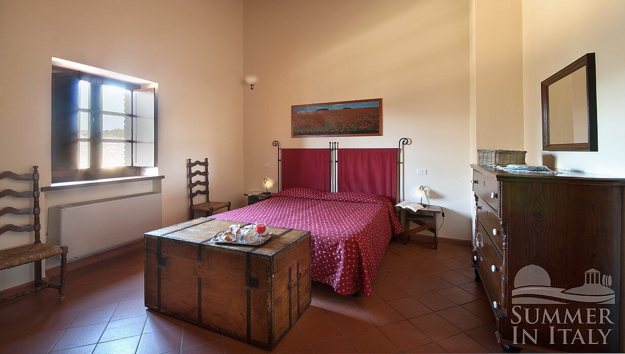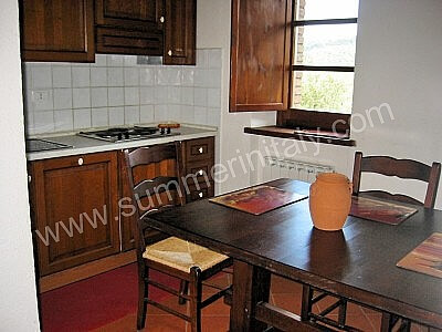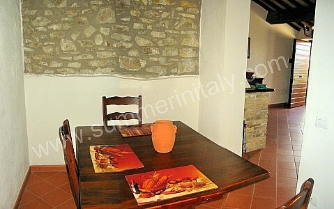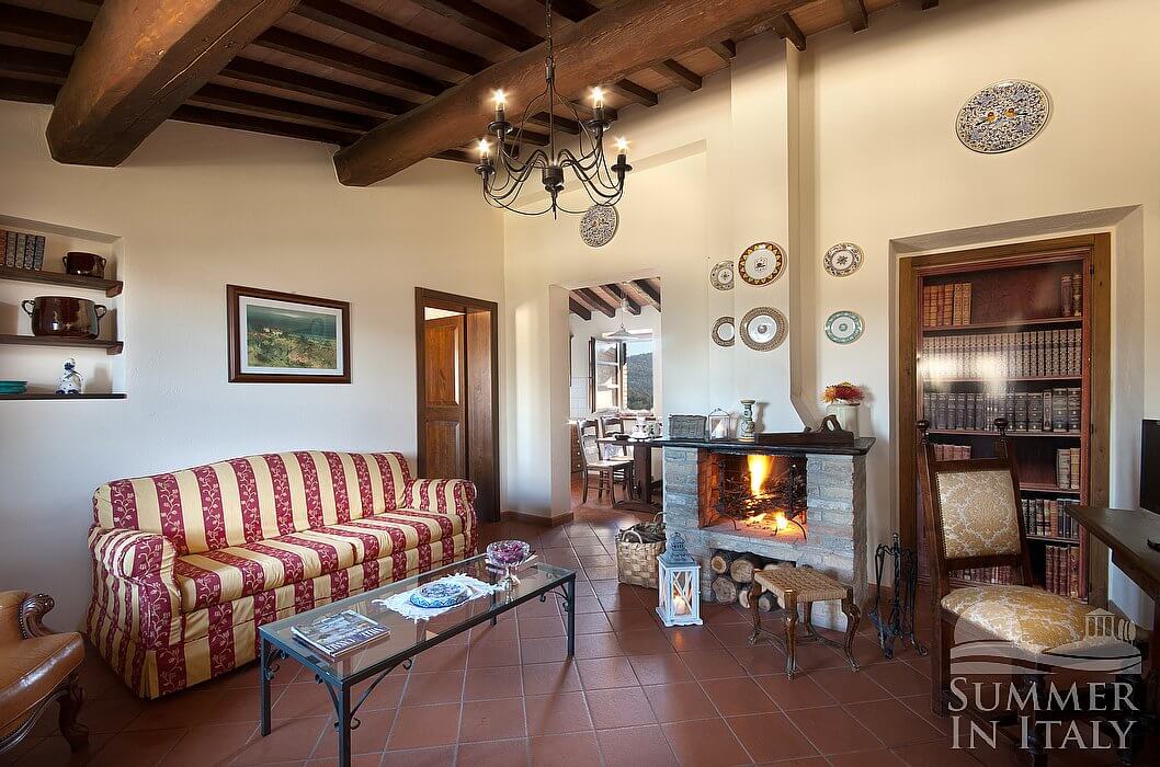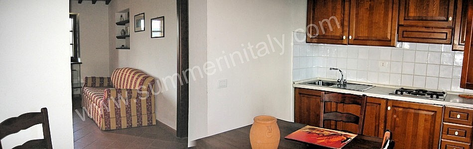 The living room is paved with Tuscan terracotta tiles. The ceiling is sloped and has characteristic exposed wood beams and terracotta tiles. The furnishings are warm and welcoming. The furnishings include a divan that unfolds into a double bed. There is a fireplace made of bricks. In this room you will find a small satellite television (local channels).