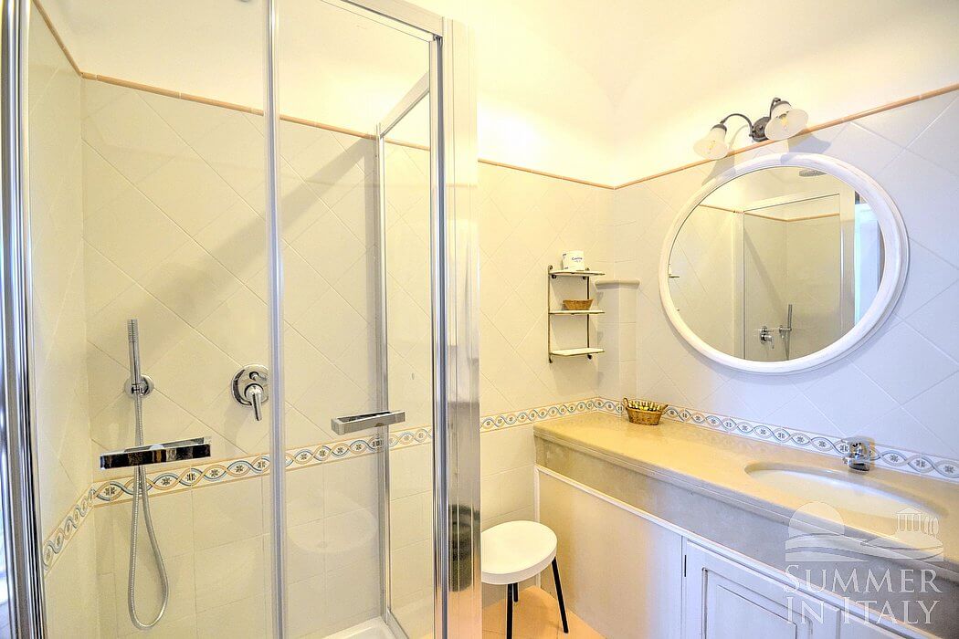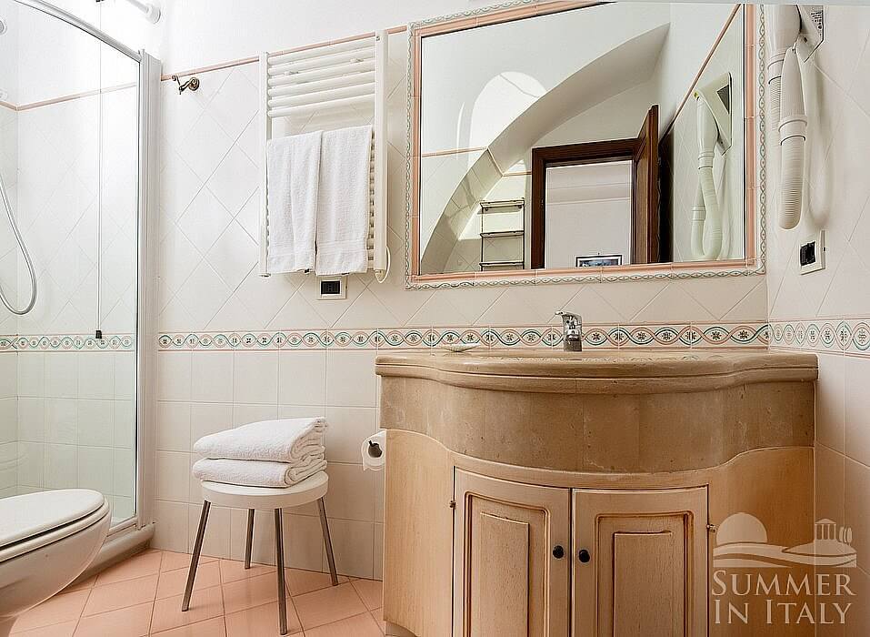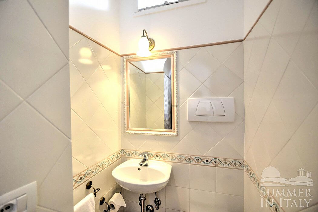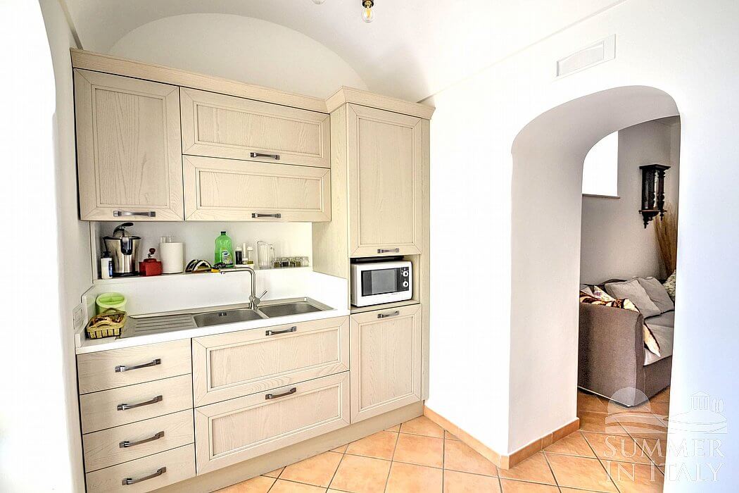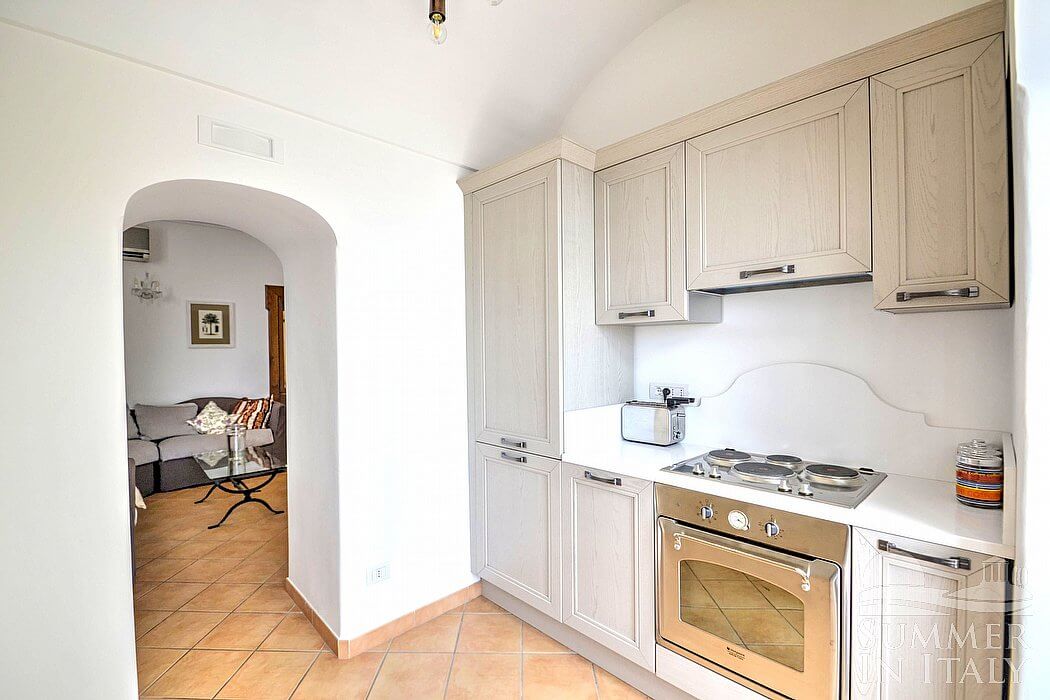 You will be able to enter the kitchen from the living room. It is equipped with a four-burner gas cooker, an electric oven, a refrigerator with freezer, a dishwasher, a microwave oven, an Italian-style coffee-maker, an American-style coffee-maker (bring your filters!) and a kettle. From the kitchen a French door will take you to the patio and the swimming pool.