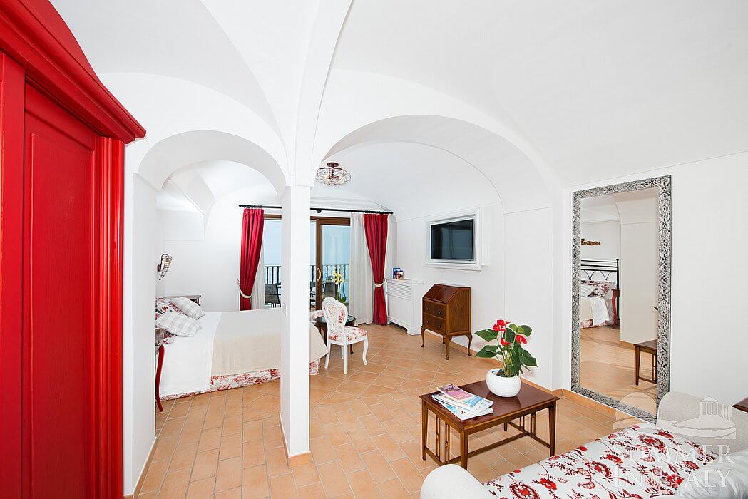This suite is made up by three interconnected rooms: a sleeping area, a sitting area and a bathroom. You will be able to enter the fourth bedroom through an access area. The bedroom has a matrimonial bed (160 cm/62 inches, wider than a queen-size bed). The furnishings include a sofa. In this room you will find a satellite television (local channels). From the bedroom you will be able to enter a small terrace with a view of the sea through a French door. The bedroom is equipped with an air conditioning/heating unit. This bedroom has an en-suite bathroom, equipped with a washbasin, a toilet, a fully enclosed shower and a hairdryer.