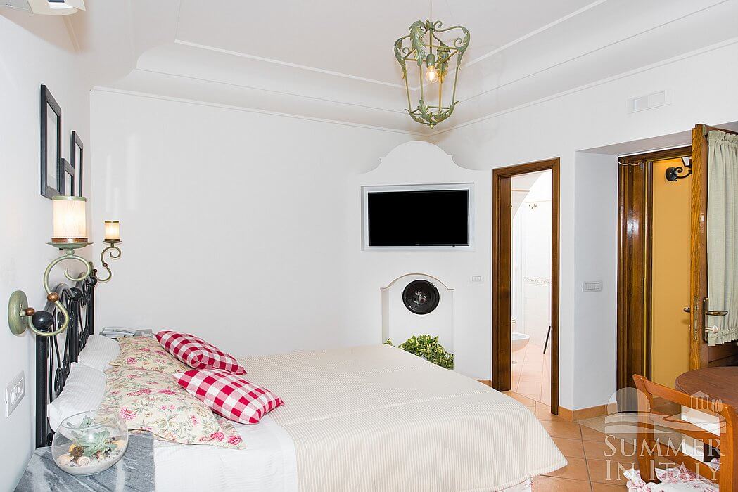 You will be able to enter the fifth bedroom through an access area. The bedroom has a matrimonial bed (160 cm/62 inches, wider than a queen-size bed). In this room you will find a satellite television (local channels). From the bedroom you will be able to enter a small terrace with a view of the sea through a French door. The bedroom is equipped with an air conditioning/heating unit. This bedroom has an en-suite bathroom, equipped with a washbasin, a toilet, a combo Jacuzzi bathtub with shower and a hairdryer.