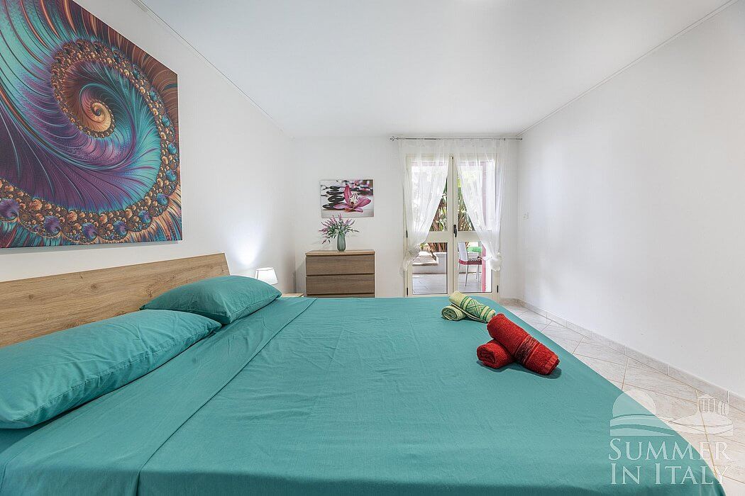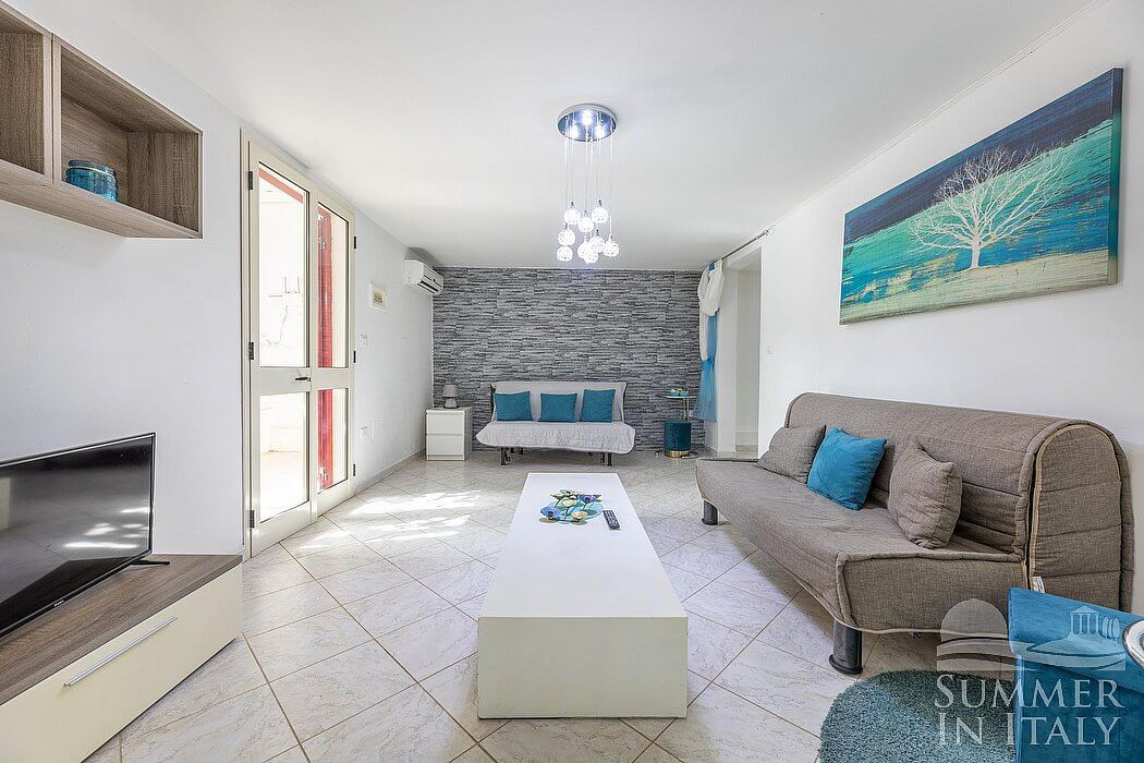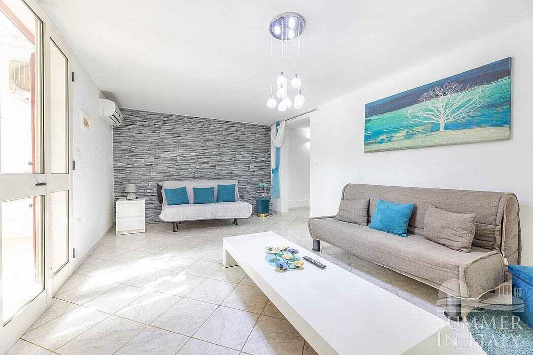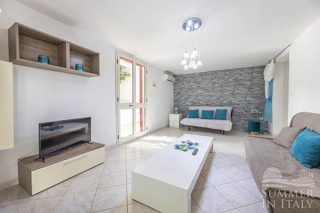 The furnishings of the living room are simple and comfortable. The furnishings include a sofa and a divan bed for one guest. In the living room you will also find a cooking area. The kitchenette is equipped with a four-burner gas cooker, an electric oven, a refrigerator with freezer and an Italian-style coffee-maker. The dining table can accommodate six guests. From the living room you will be able to enter the verandah through a French door. The room has a window with a view of the garden. It is equipped with an air conditioning/heating unit.