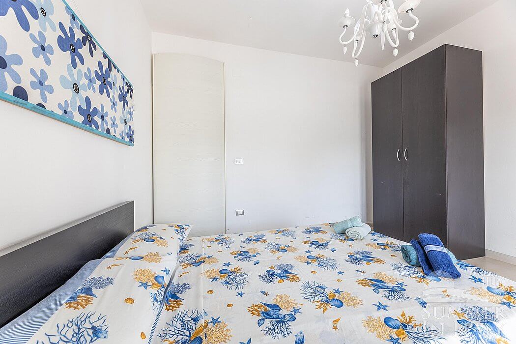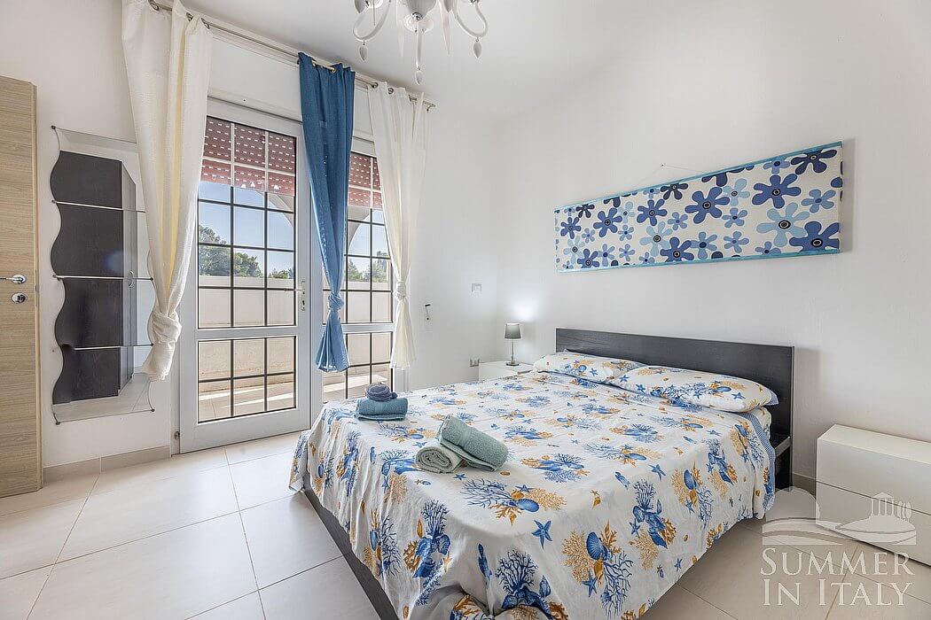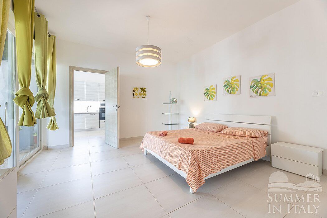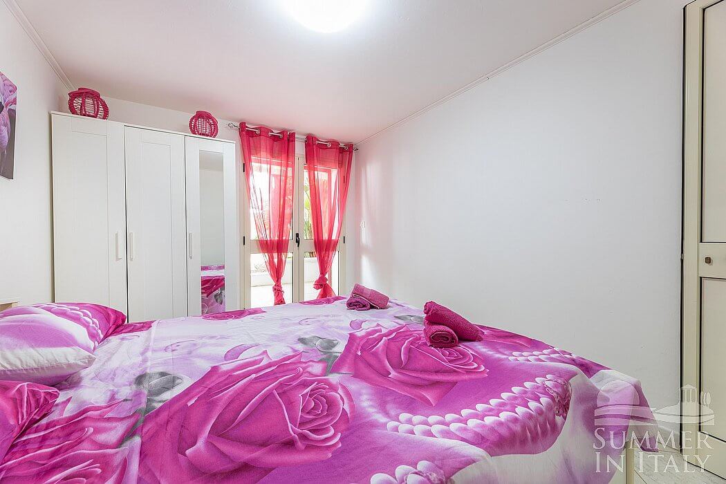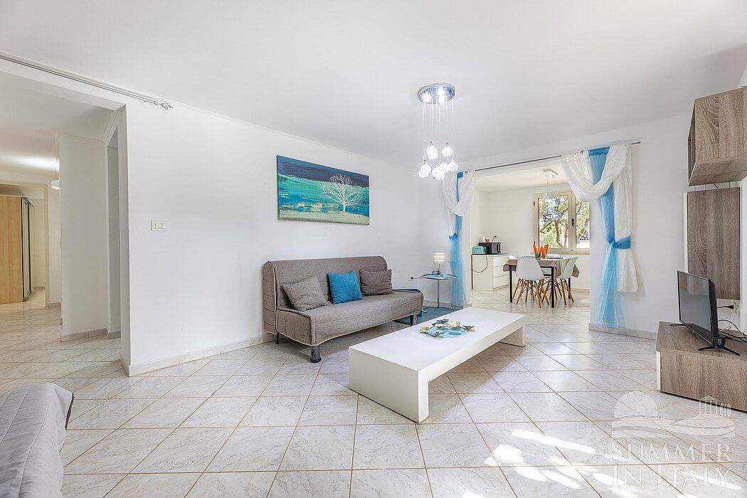 The furnishings of the living room are simple and comfortable. The furnishings include a sofa and a divan bed for one guest. In the living room you will also find a cooking area. The kitchenette is equipped with a four-burner gas cooker, an electric oven, a refrigerator with freezer and an Italian-style coffee-maker. The dining table can accommodate six guests. From the living room you will be able to enter the verandah through a French door. The room has a window with a view of the garden. It is equipped with an air conditioning/heating unit.
