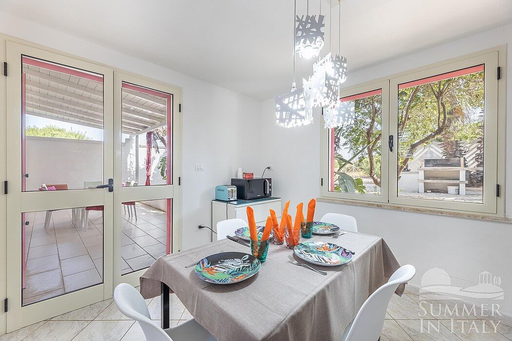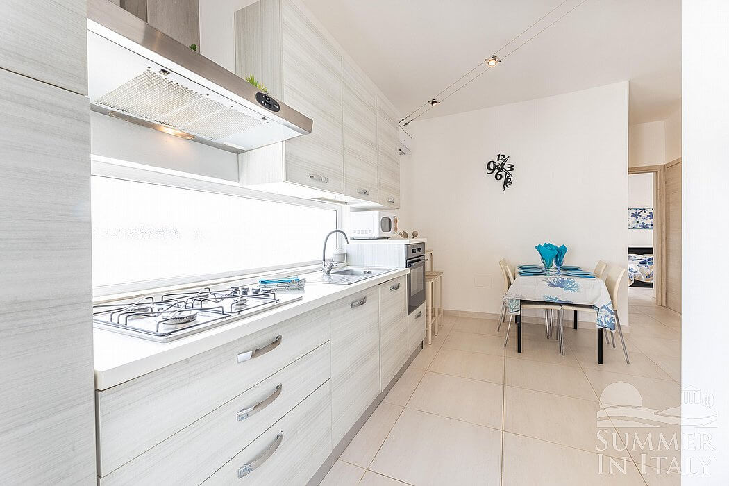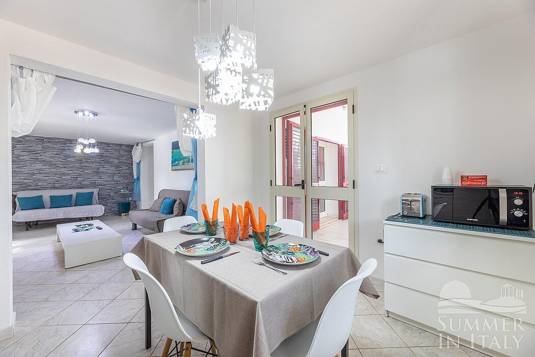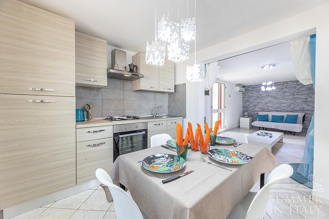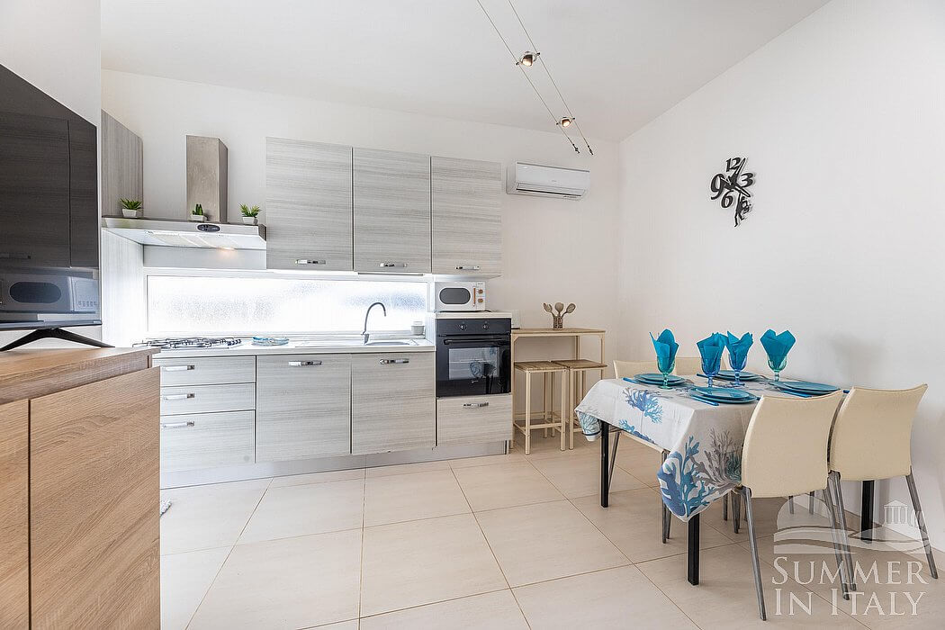 You will be able to enter the kitchen from the living room. It is equipped with a four-burner gas cooker, an electric oven, a refrigerator with freezer and an Italian-style coffee-maker. The dining table can accommodate six guests. The kitchen is also equipped with a television (local channels). From the kitchen a French door will take you to the patio. The kitchen is equipped with an air conditioning/heating unit.