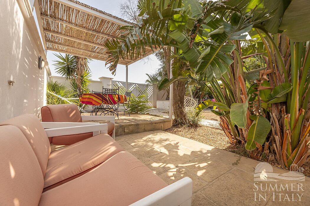 The villas are surrounded by a large garden with lush Mediterranean vegetation.