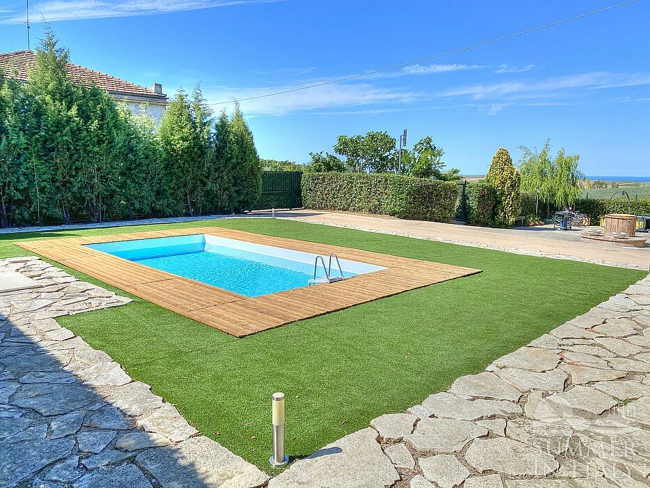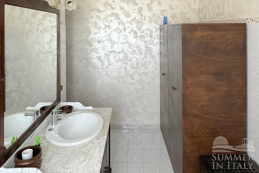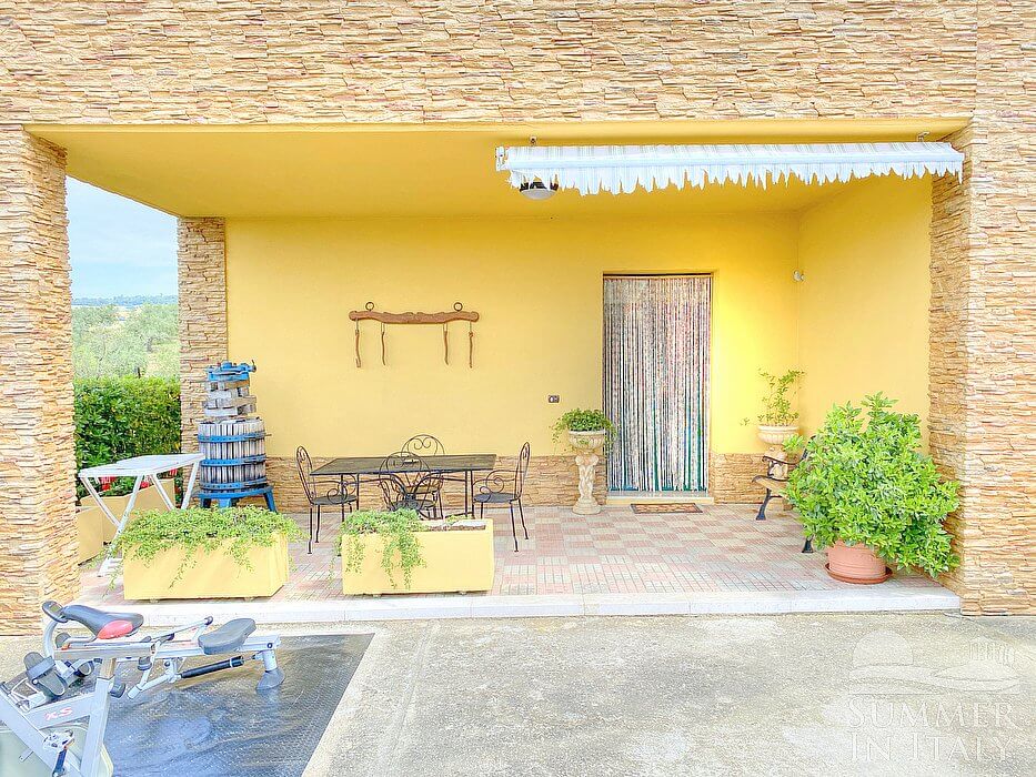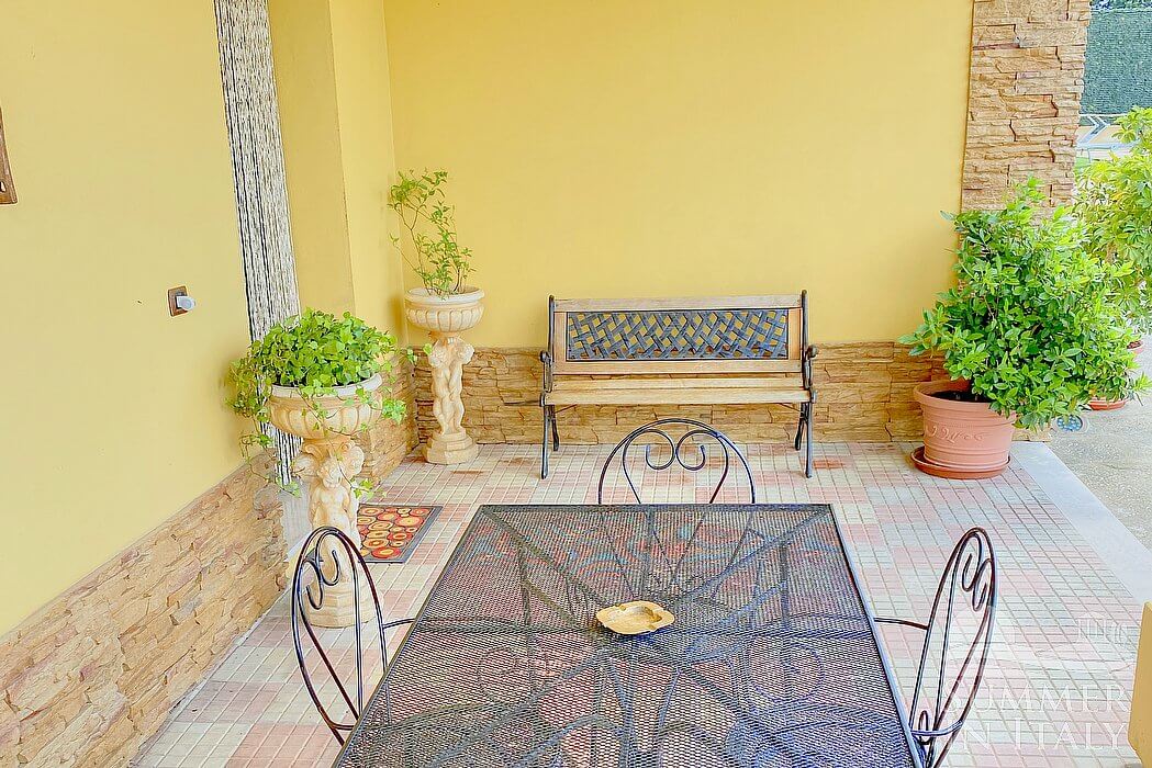 The patio is 100 square meters (1076 square feet) large. It is partly shaded by a porch made of stone and by a retractable awning. It is equipped with a wood bench and with a table and chairs. In the patio you will be able to have fun with a ping pong table. Here you will also find a portable barbecue, as well as a fitness area equipped with an exercise bike. From the patio you will enjoy a broad view of the greenery and of the surrounding countryside.