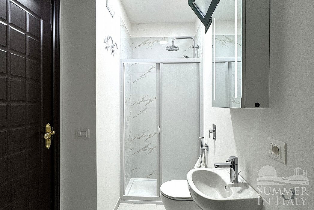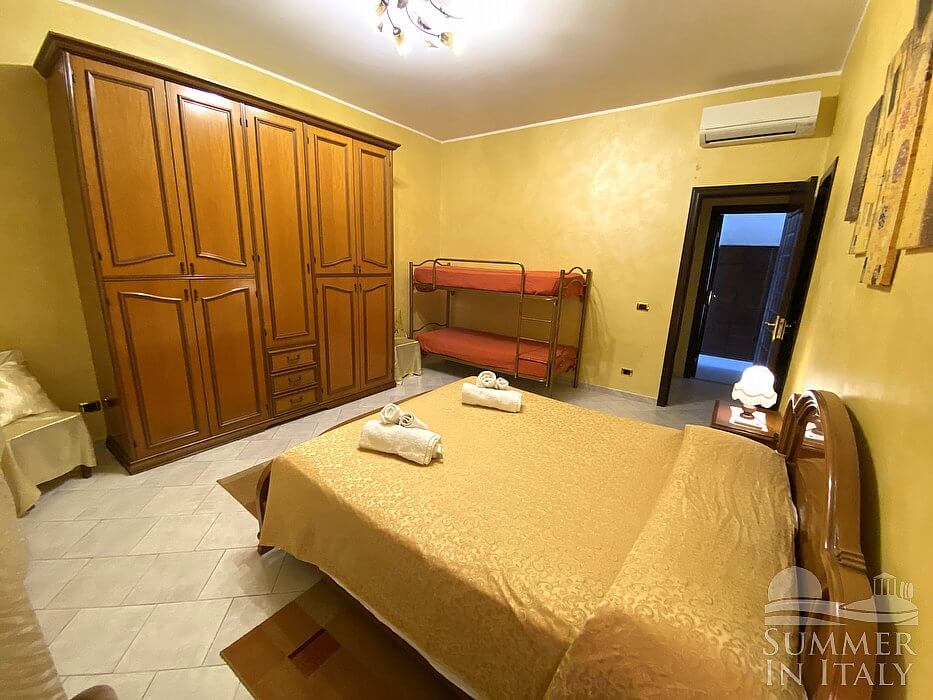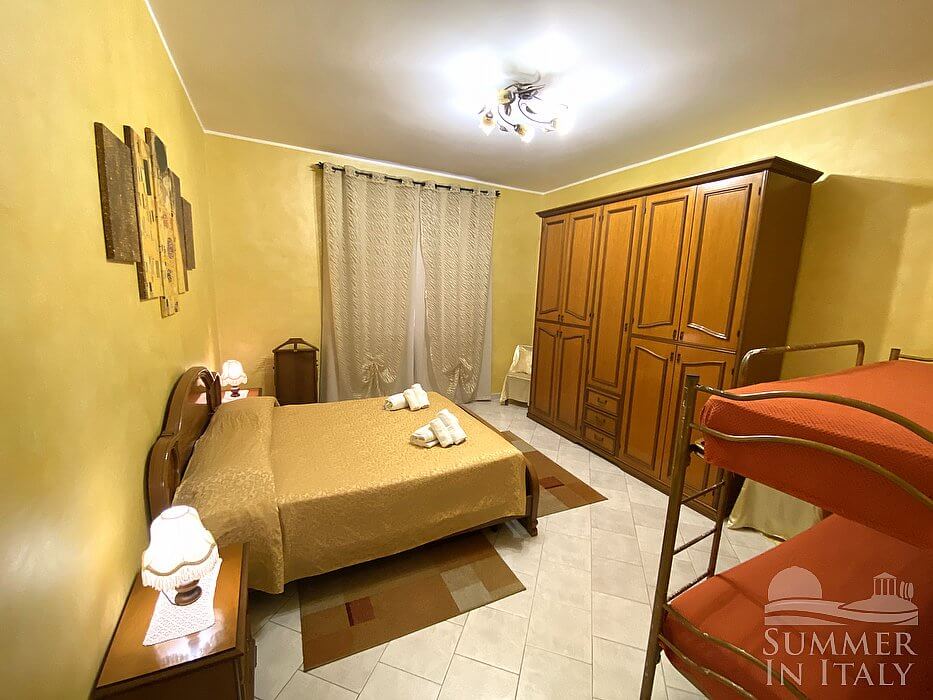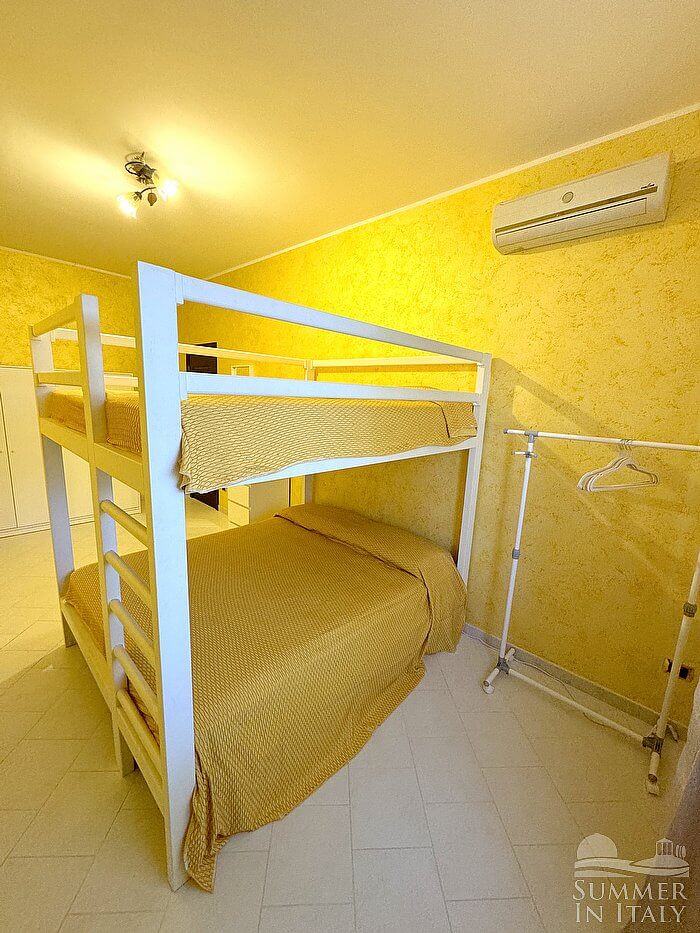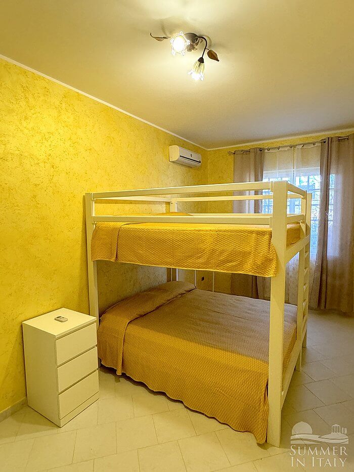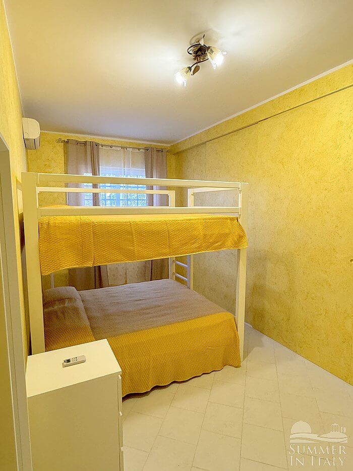 You will be able to enter the first bedroom through a corridor. The bedroom has a matrimonial bed (160 cm/63 inches, wider than a queen-size bed) and a bunk bed (two single beds, one on top of the other). The room has a window, and it's equipped with an air conditioning/heating unit. This bedroom has an en-suite bathroom, equipped with a washbasin, a toilet, a fully enclosed shower and a hairdryer.
