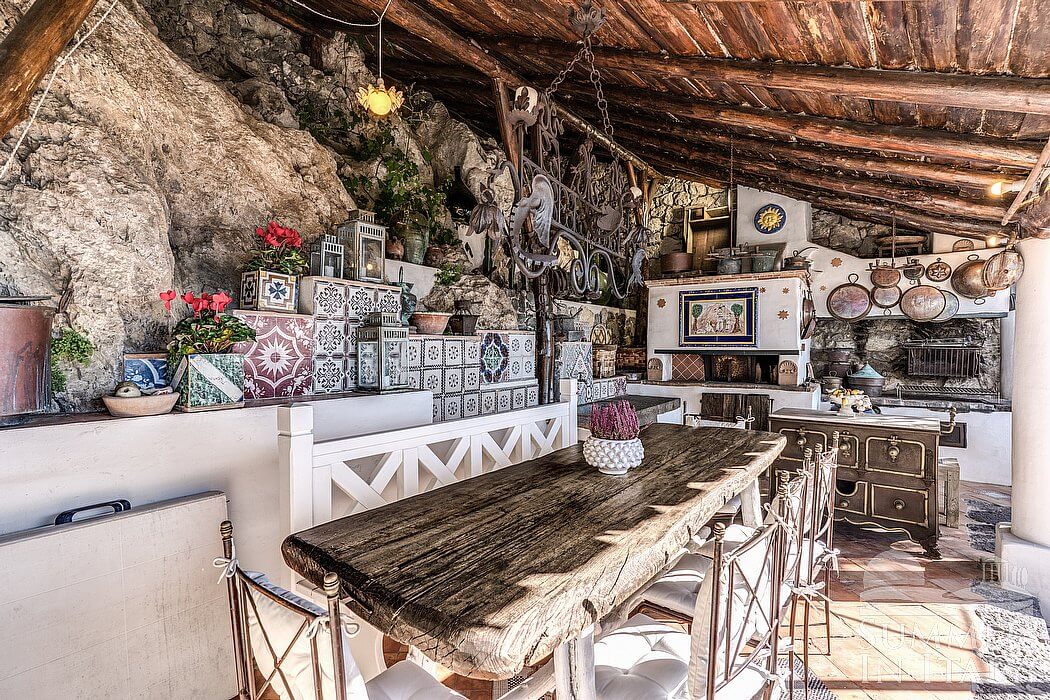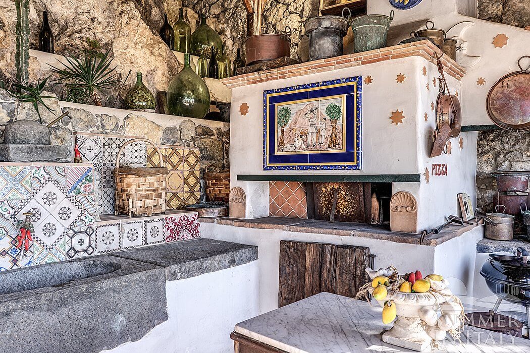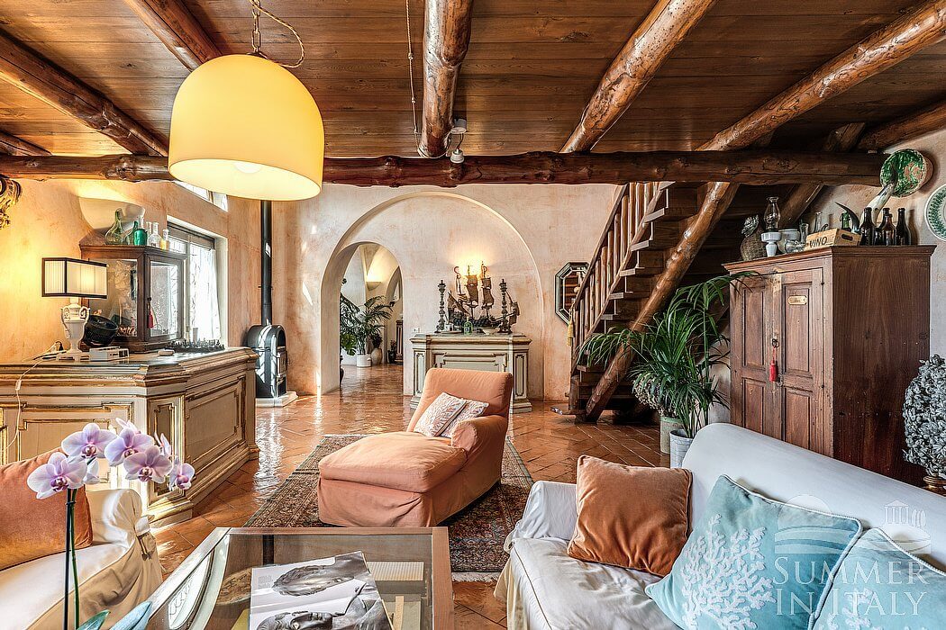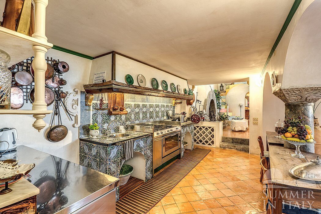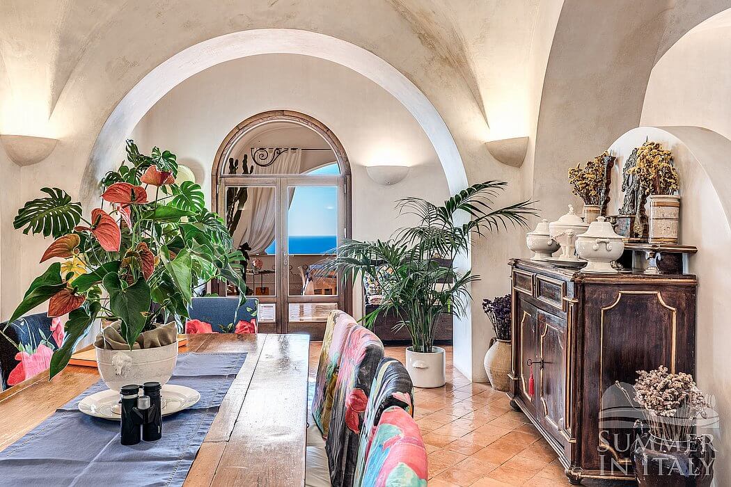 The first living room is paved with original terracotta tiles. The ceiling is high and vaulted. The furnishings are classic and welcoming, featuring some antique pieces, and include an armchair and wood benches. There is a big and elegant fireplace made of stone, for decorative purposes only. In the living room you will also find a cooking area. The kitchenette is very well equipped, with a five-burner gas cooker, an electric oven, a large refrigerator with freezer, a dishwasher, a microwave oven, an Italian-style coffee-maker, a toaster and other small appliances. The dining table can accommodate ten guests. From the living room you will be able to enter the third terrace with a view of the sea and of the coastline through a French door. The room has two windows with a view of the sea and of the island of Li Galli. It is equipped with an air conditioning/heating unit.