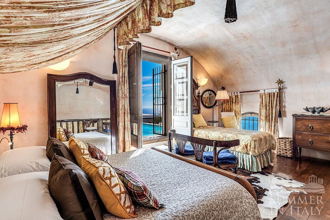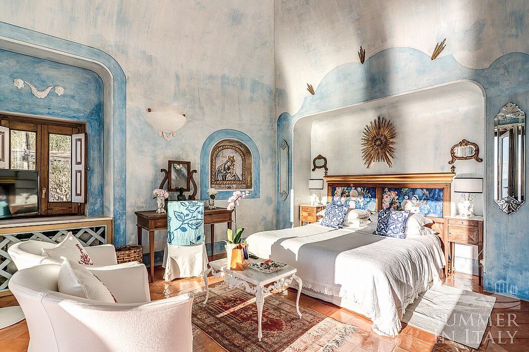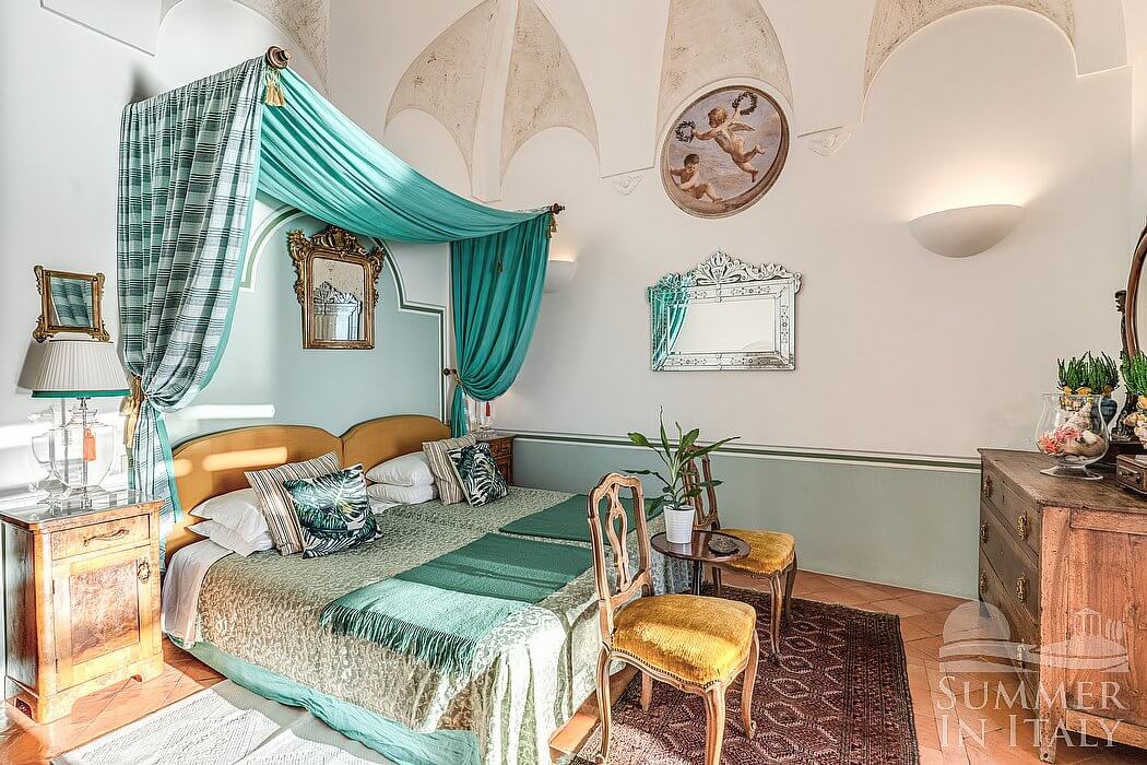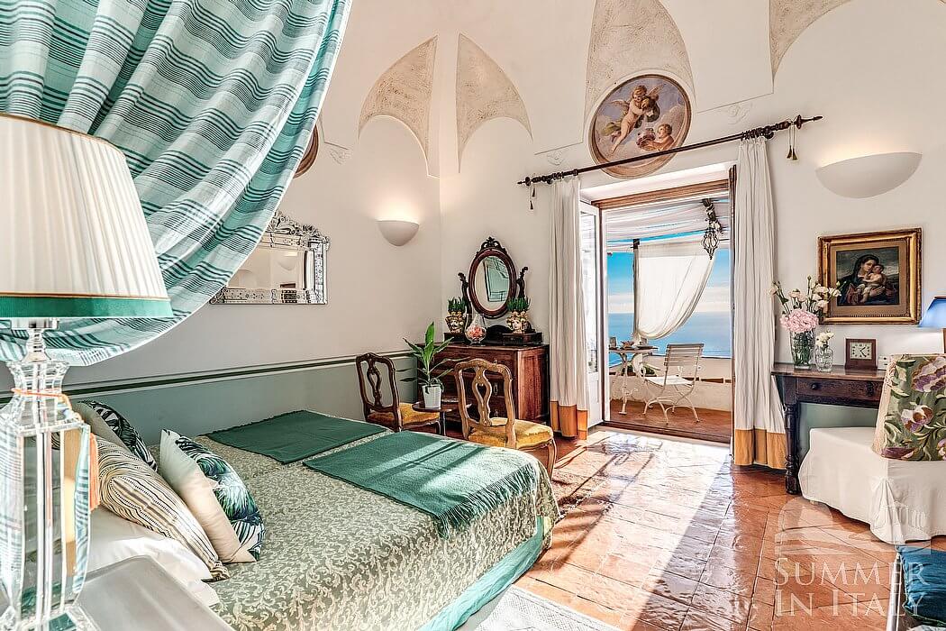 You will be able to enter the third bedroom from the corridor. The ceiling is high and vaulted. It has two twin beds (80 cm/32 inches), that can be pushed together into a matrimonial bed if requested (please contact our staff in advance to make arrangements). The furnishings include an armchair and a desk. From the bedroom you will be able to enter the fourth terrace with a view of the sea and of the coast of Amalfi through a French door. The bedroom is equipped with an air conditioning/heating unit.