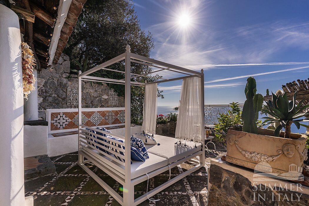 The fourth terrace is 50 square meters (540 square feet) large. You will be able to enter it from the second bedroom and from the third bedroom. It is partly shaded by a pergola with a bamboo roof. It is equipped with masonry benches, as well as with tables, chairs and a deck chair. From the terrace you will enjoy a fascinating view of the sea, of Praiano and the coast of Amalfi and of the small Li Galli islands at a distance.