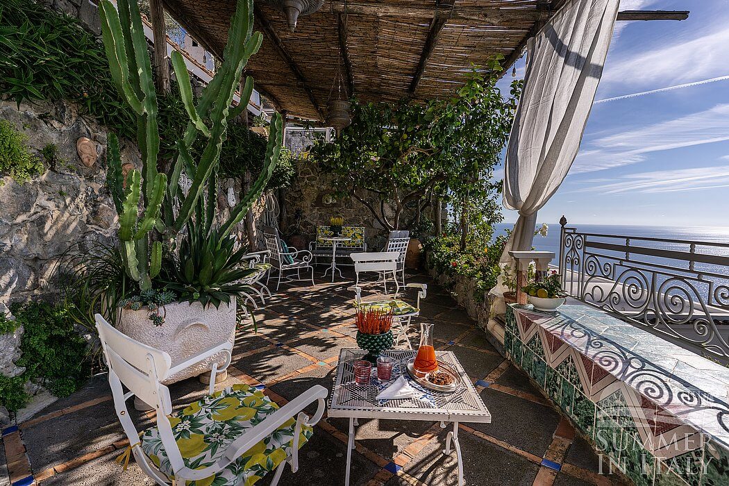 The first terrace is 20 square meters (215 square feet) large. You will be able to enter it from the first living room or from the corridor through an arched French door. It is shaded by a tall porch made of stone. It is equipped with tables and chairs. From the terrace you will enjoy a wonderful view of the sea, of Praiano and the coast of Amalfi.