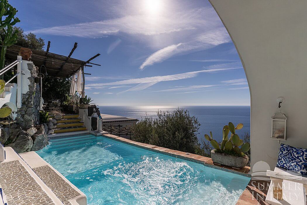 The swimming pool is 2.5 meters (8 feet) large by 8 meters (26 feet) long, from 20 centimeters (8 inches) 2.2 meters (7.2 feet) deep. It has a whirlpool corner. The area is equipped with a table, chairs, a sun umbrella, two deck chairs and an external shower. From the swimming pool you will enjoy a fascinating view of the sea and of the small Li Galli islands at a distance. The pool is open from the beginning of May until the end of October.