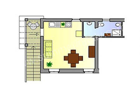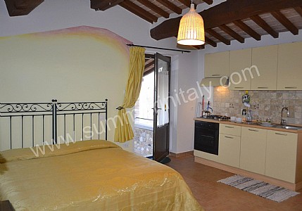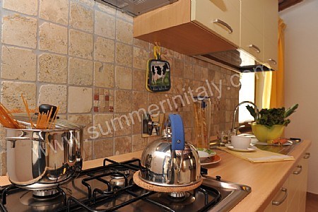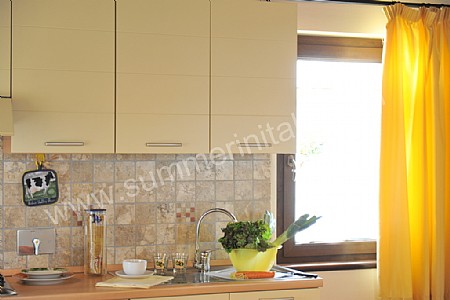 The furnishings of the living room are bright and cheerful. Here you will find a wrought iron matrimonial bed (160 cm/62 inches, wider than a queen-size bed). In the living room you will also find a cooking area. The kitchenette is equipped with a four-burner gas cooker, an electric oven, a refrigerator with freezer and an Italian-style coffee-maker. The dining table can accommodate two guests. In this room you will find a flat-screen satellite television (local channels). The room has a window with a view of the garden and of the swimming pool.