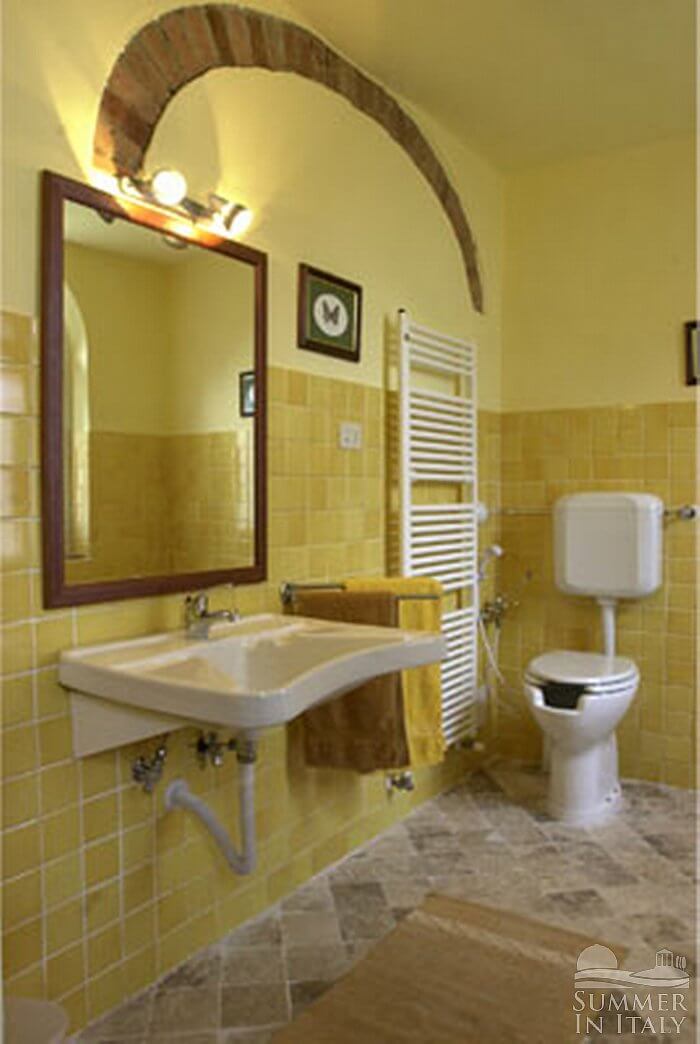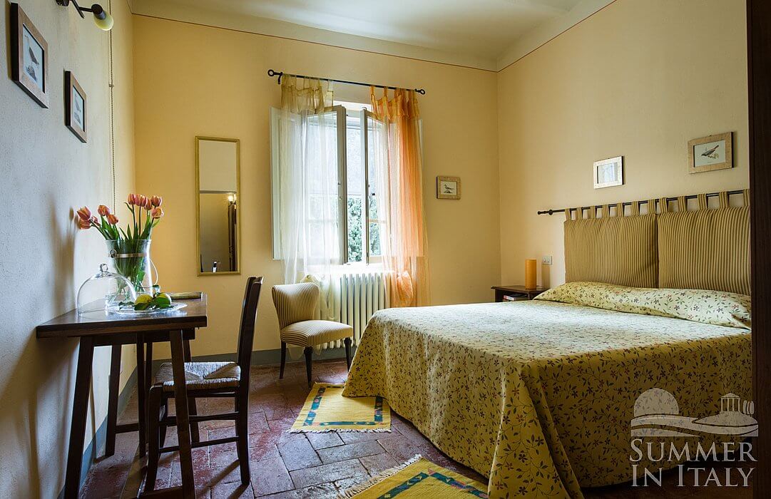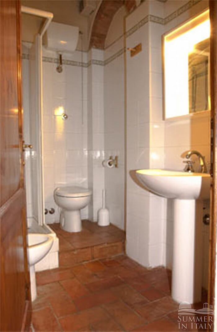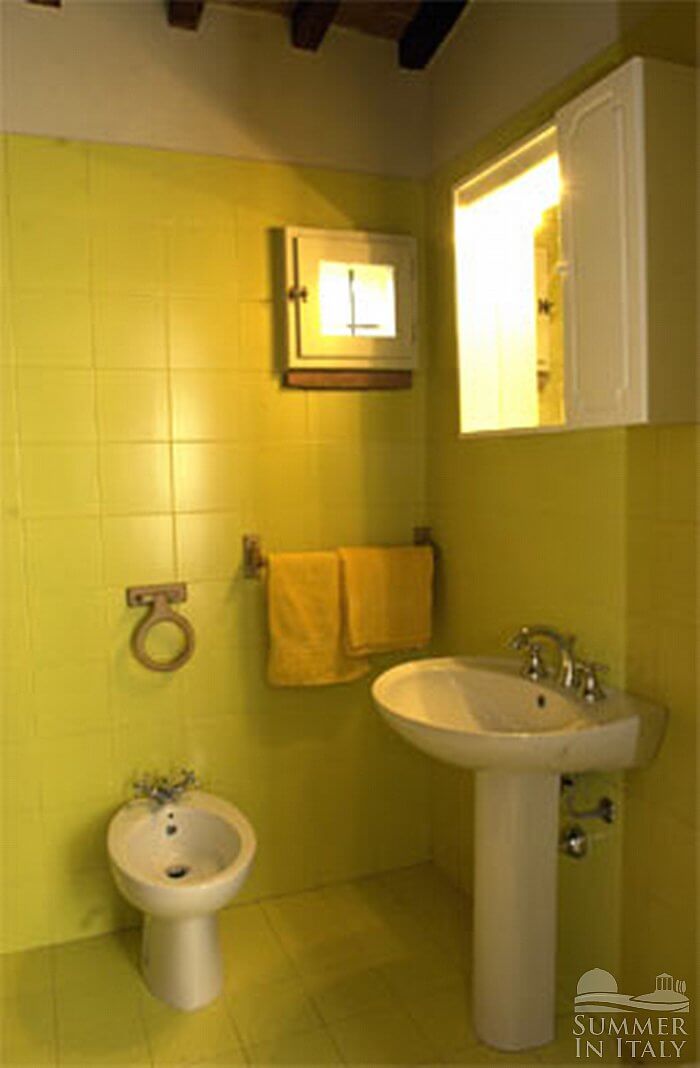 This suite is made up by three interconnected rooms: a sleeping area, a sitting area and a bathroom. You will be able to enter the ninth bedroom from the garden. The furnishings are simple. The room has a matrimonial bed (160 cm/63 inches, wider than a queen-size bed). The furnishings include an armchair. There is also a cooking area. The kitchenette is equipped with a four-burner gas cooker, an electric oven, a refrigerator with freezer and an Italian-style coffee-maker. In this room you will find a satellite television (local channels). From the bedroom you will be able to enter the garden through a French door. The room has two windows with a view of the garden, and it's equipped with an air conditioning/heating unit. This bedroom has an en-suite bathroom, equipped with a washbasin, a toilet, a shower and a hairdryer.
