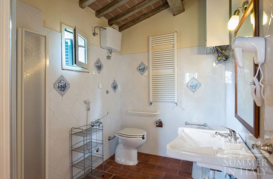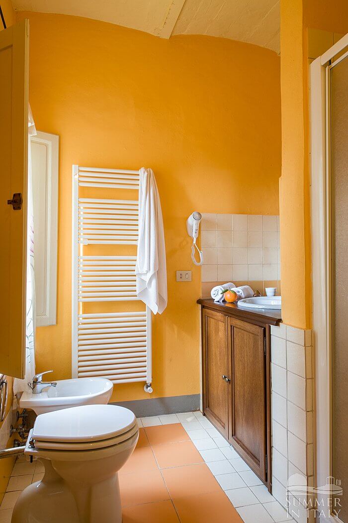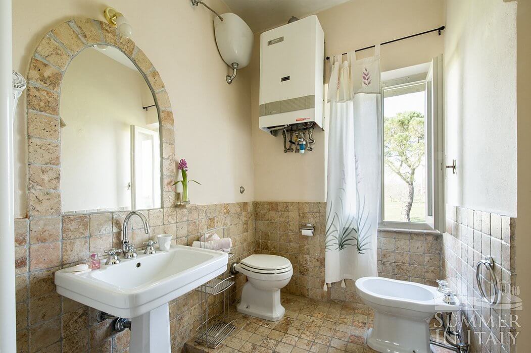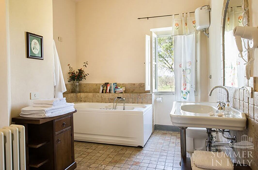 You will be able to enter the seventh bedroom from the corridor. The bedroom has a matrimonial bed (160 cm/63 inches, wider than a queen-size bed). The room has a window with a view of the garden and of the hills, and it's equipped with an air conditioning/heating unit. This bedroom has an en-suite bathroom, spacious and equipped with a washbasin, a toilet, a jacuzzi bathtub and a hairdryer.