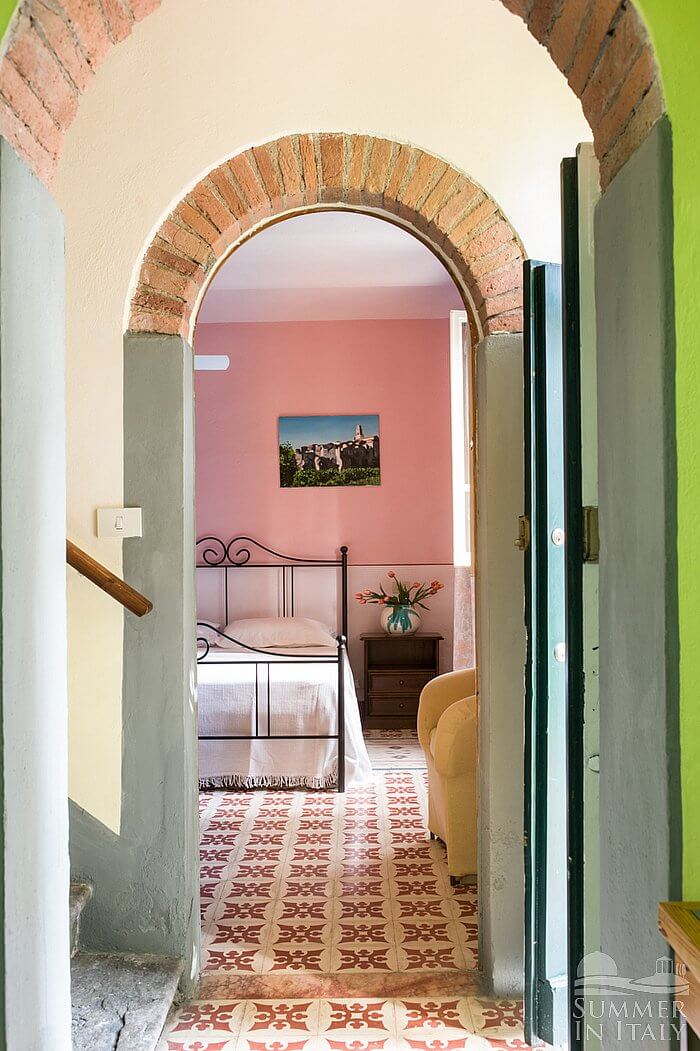 This suite is made up by three interconnected rooms: a sleeping area, a sitting area and a bathroom. You will be able to enter the fifth bedroom from the corridor. The bedroom has a matrimonial bed (160 cm/63 inches, wider than a queen-size bed), located on the mezzanine level. The furnishings include a divan that unfolds into a double bed. The room has a window with a view of the garden and of the hills, and it's equipped with an air conditioning/heating unit. This bedroom has an en-suite bathroom, equipped with a washbasin, a toilet, a fully enclosed shower and a hairdryer.