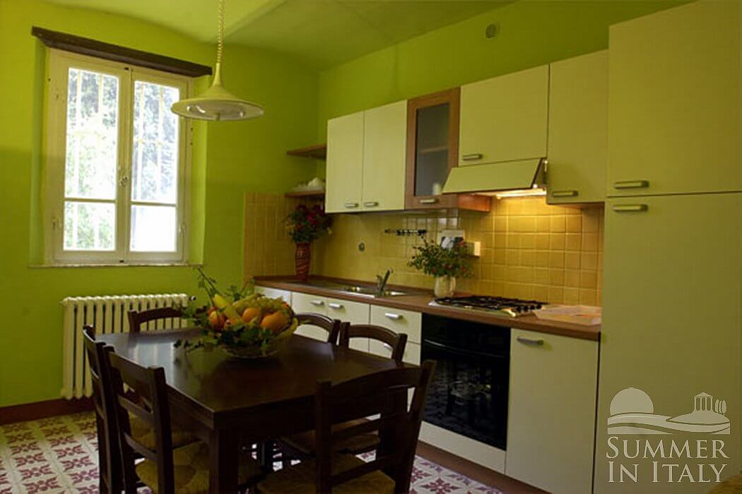 You will be able to enter the second kitchen from the living room. It is well equipped, with a four-burner gas cooker, an electric oven, a refrigerator with freezer, a dishwasher, a microwave oven, an Italian-style coffee-maker and an American-style coffee-maker. The dining table can accommodate eight guests. The kitchen has a window.