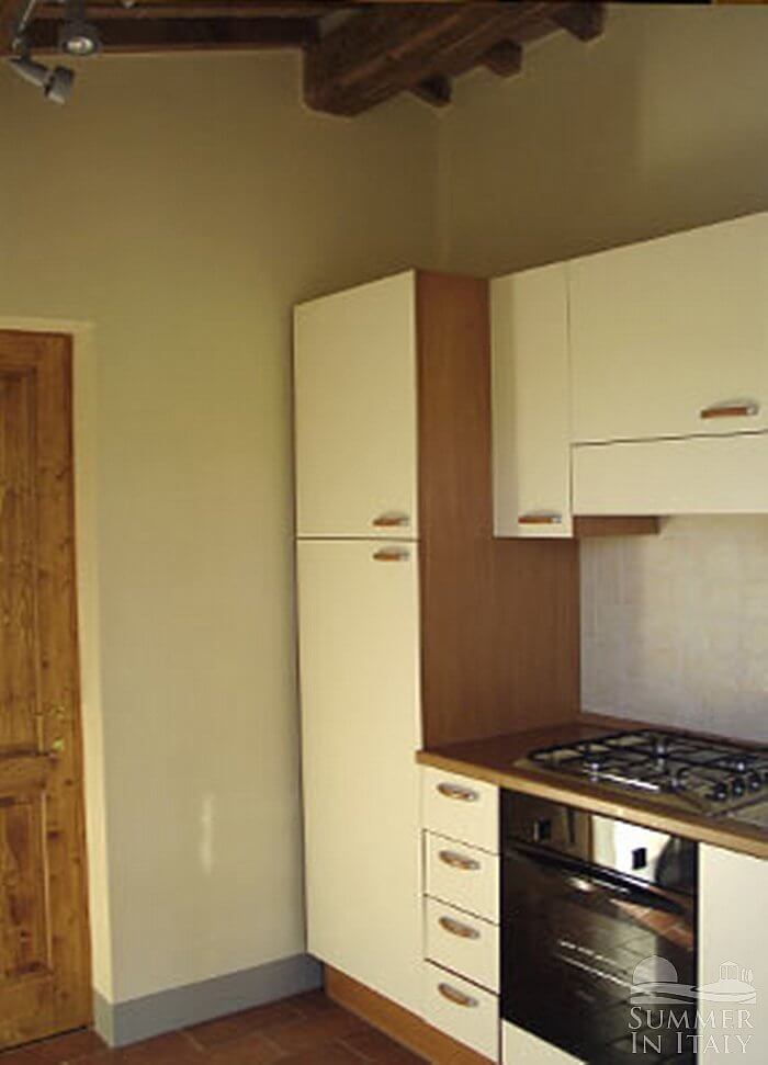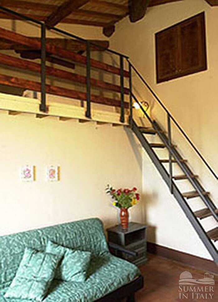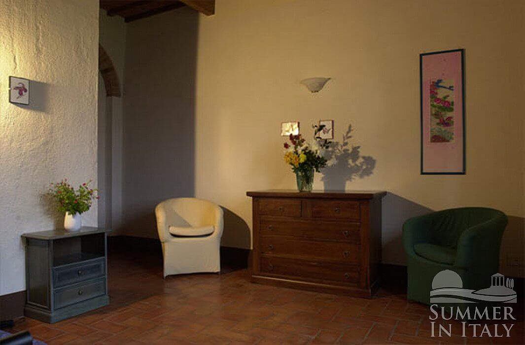 The living room is paved with Tuscan terracotta tiles. The ceiling has characteristic exposed wood beams. The furnishings are simple and comfortable, and include sofas and armchairs. There is a nice fireplace made of bricks and Firenzuola stone. In this room you will find a satellite television (local channels). From the living room you will be able to enter the garden through a French door. The room has three windows with a view of the garden and of the surrounding green fields. It is equipped with an air conditioning/heating unit.