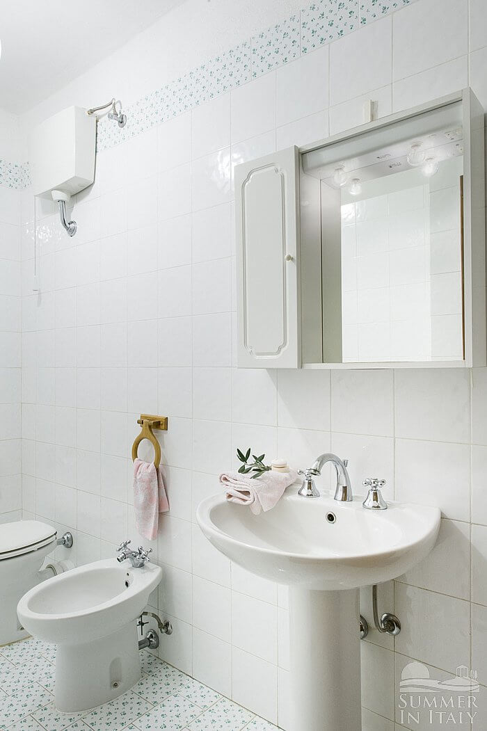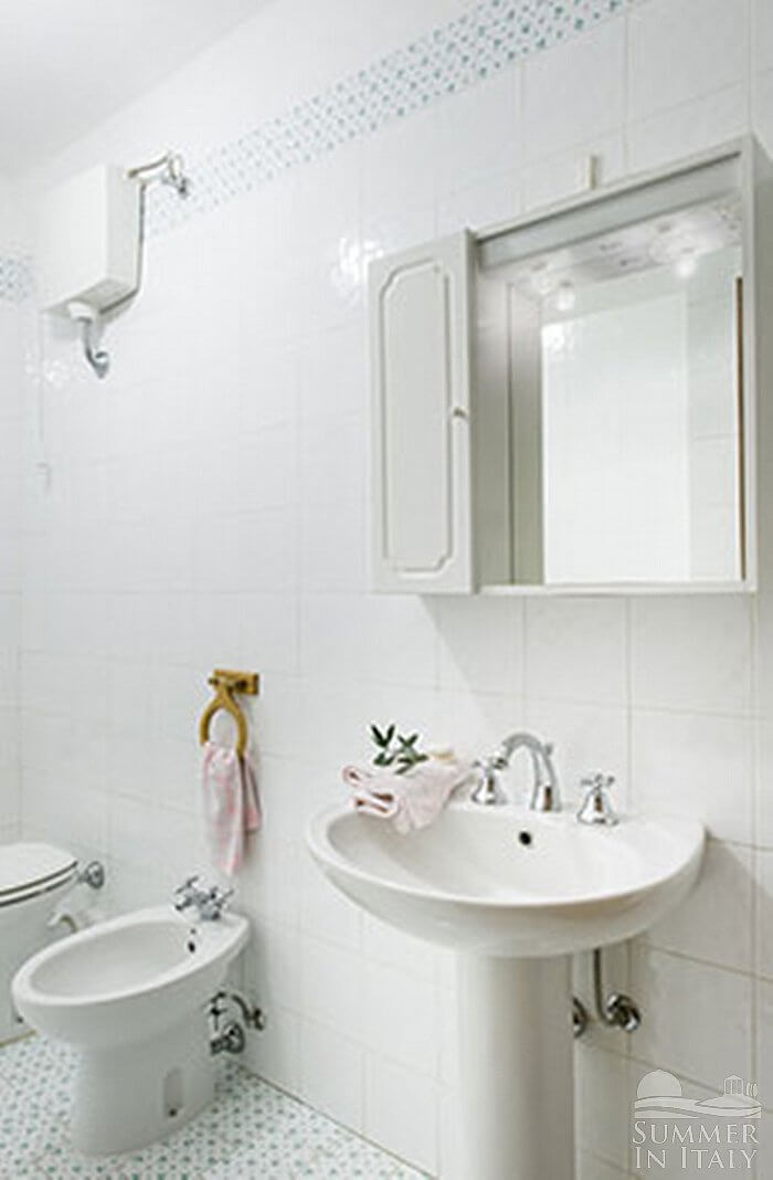 You will be able to enter the third bedroom from the corridor. It has two twin beds (80 cm/32 inches), that can be pushed together into a matrimonial bed if requested (please contact our staff in advance to make arrangements). From the bedroom you will be able to enter the garden through a French door. The bedroom is equipped with an air conditioning/heating unit.