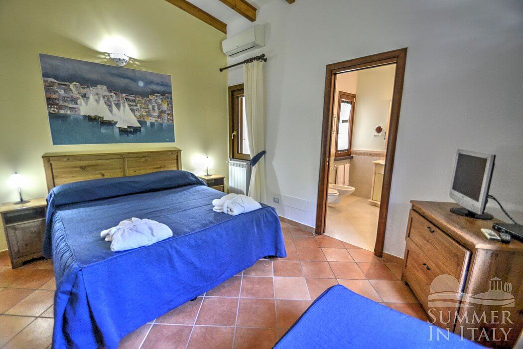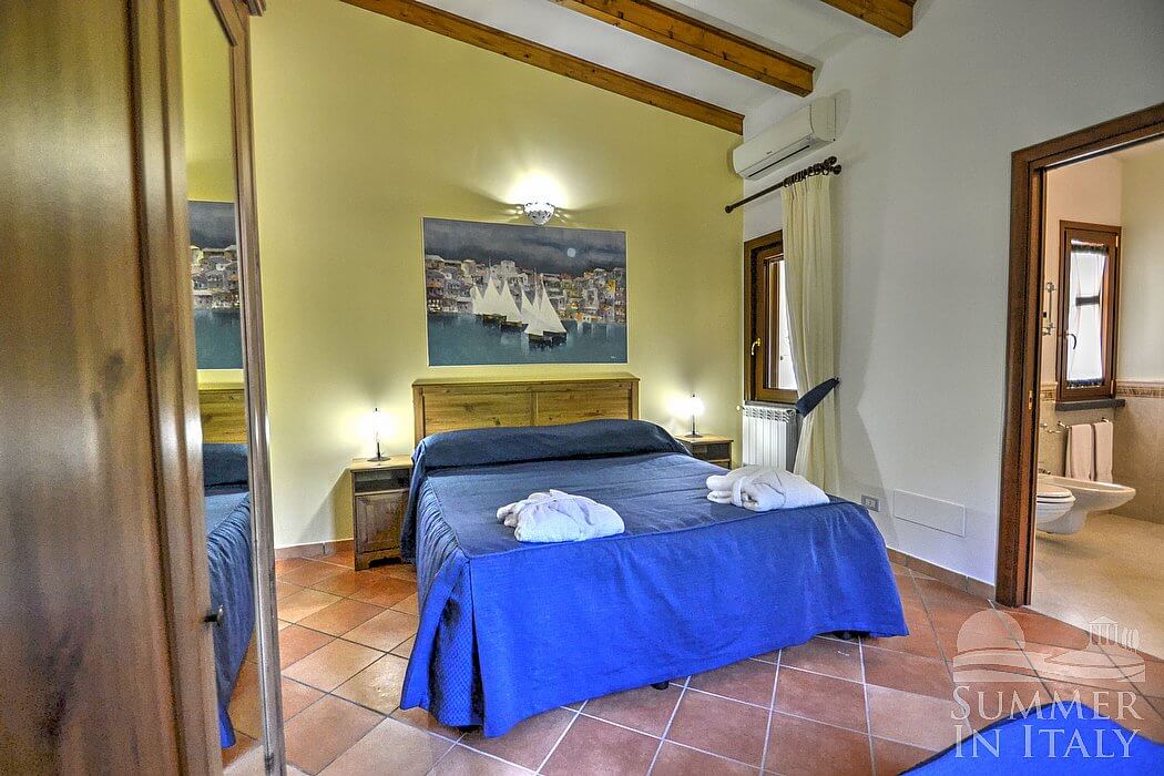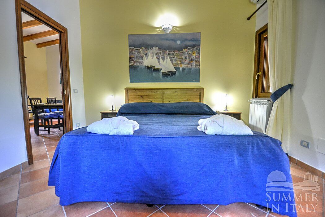 You will be able to enter the first bedroom from the living room. The bedroom has a matrimonial bed (160 cm/62 inches, wider than a queen-size bed), that can be split into twins if requested (please contact our staff in advance to make arrangements). In this room you will find a satellite television (local channels). The room has a window with a view of the garden. The bedroom is equipped with an air conditioning/heating unit. This bedroom has an en-suite bathroom, equipped with a washbasin, a toilet, large fully-enclosed shower and a hairdryer.
