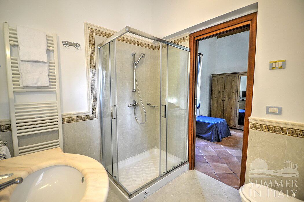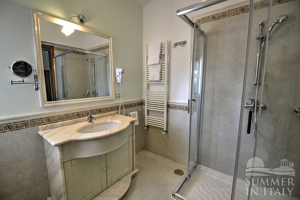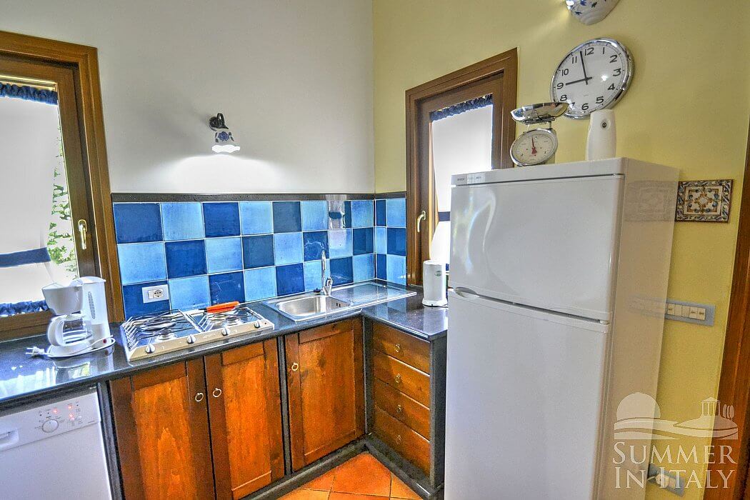 The furnishings of the living room are elegant and welcoming. The furnishings include a sofa and a divan that unfolds into a double bed (available upon request -- please contact our staff in advance). In the living room you will also find a cooking area. The kitchenette is equipped with a three-burner gas cooker and one electric burner, an electric oven, a refrigerator with freezer, a dishwasher, an Italian-style coffee-maker and an American-style coffee-maker (bring your filters!). The dining table can accommodate six guests. In this room you will find a satellite television (local channels). From the living room you will be able to enter the patio and the garden through a French door. The room has three windows with a view of the garden. It is equipped with an air conditioning/heating unit.