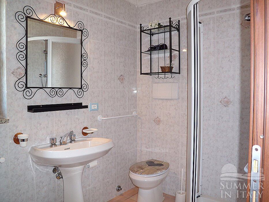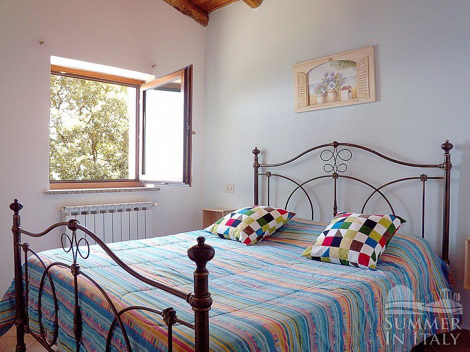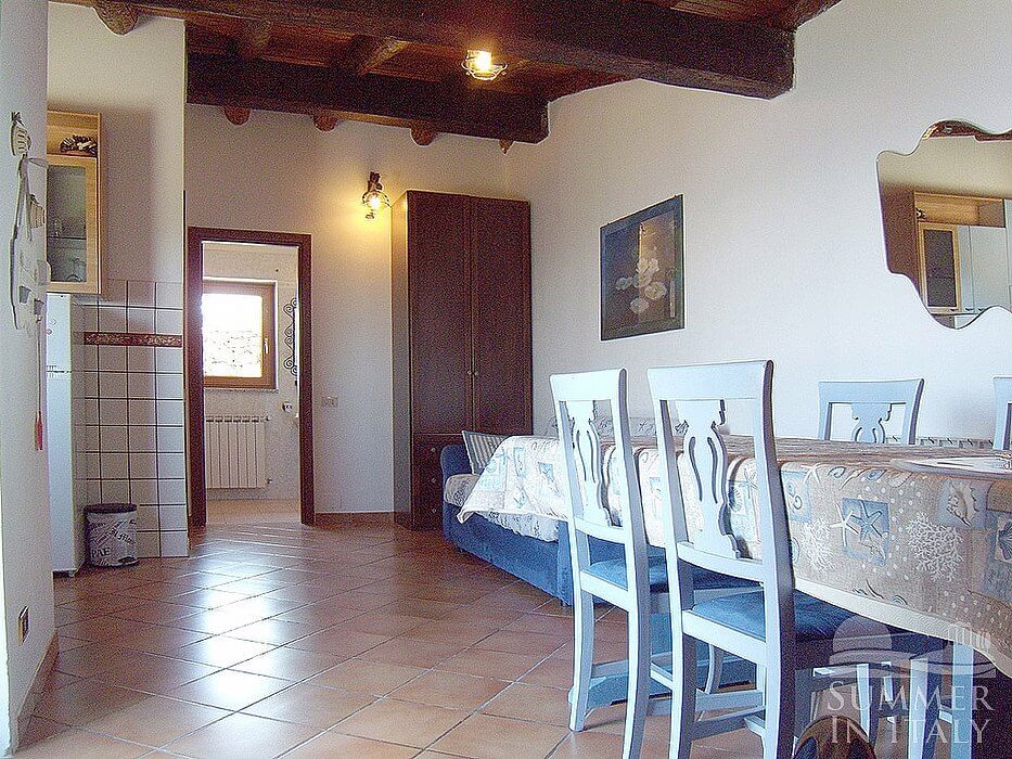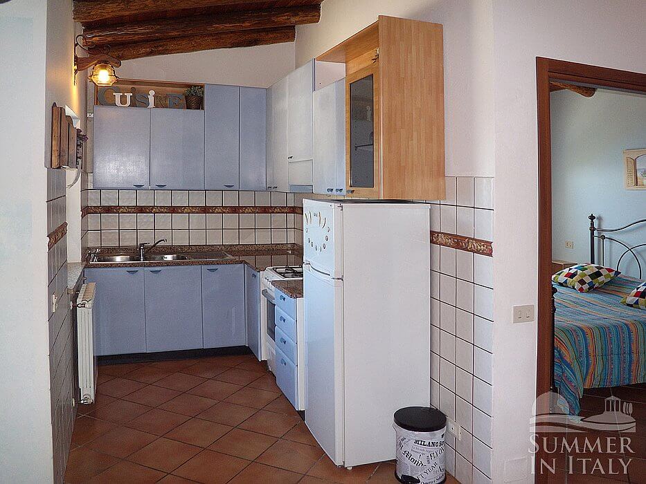 The living room is paved with characteristic terracotta tiles. The ceiling is sloped and has characteristic exposed wood beams. The furnishings are cozy and comfortable. The furnishings include a divan that unfolds into a double bed. There is a nice fireplace made of stone. In the living room you will also find a cooking area. The kitchenette is equipped with a four-burner gas cooker, an electric oven, a refrigerator with freezer, an Italian-style coffee-maker and other small appliances. The dining table can accommodate four guests. In this room you will find a television (local channels). From the living room you will be able to enter the terrace with a view of the sea and of the coastline through a double-glazed French door. The room has a double-glazed window with a view of the sea and of the terrace.
